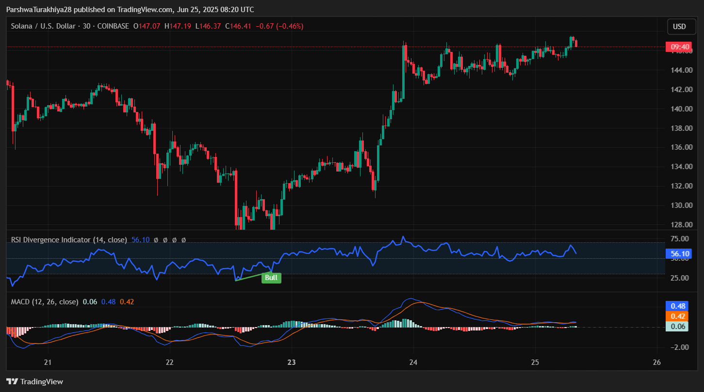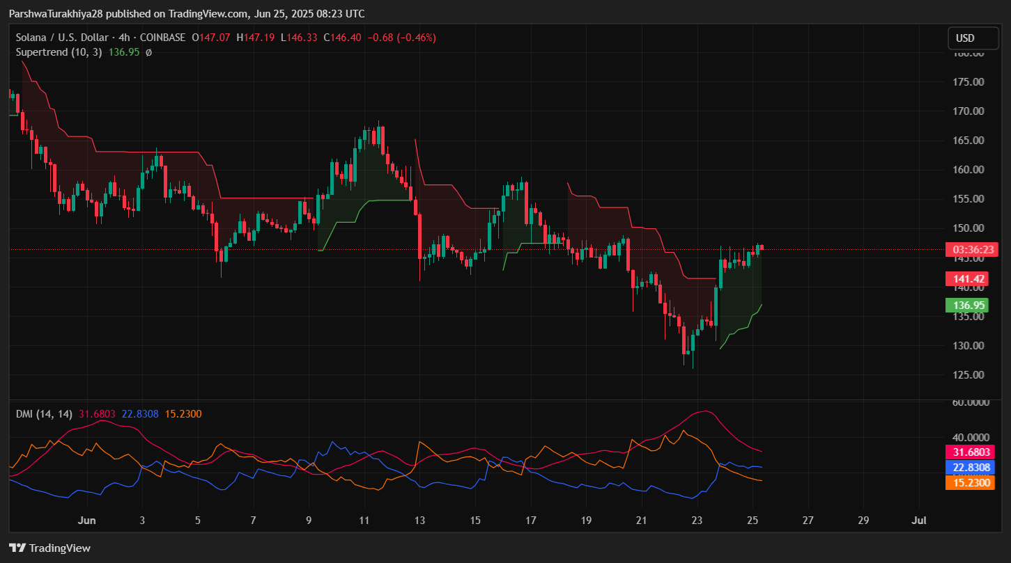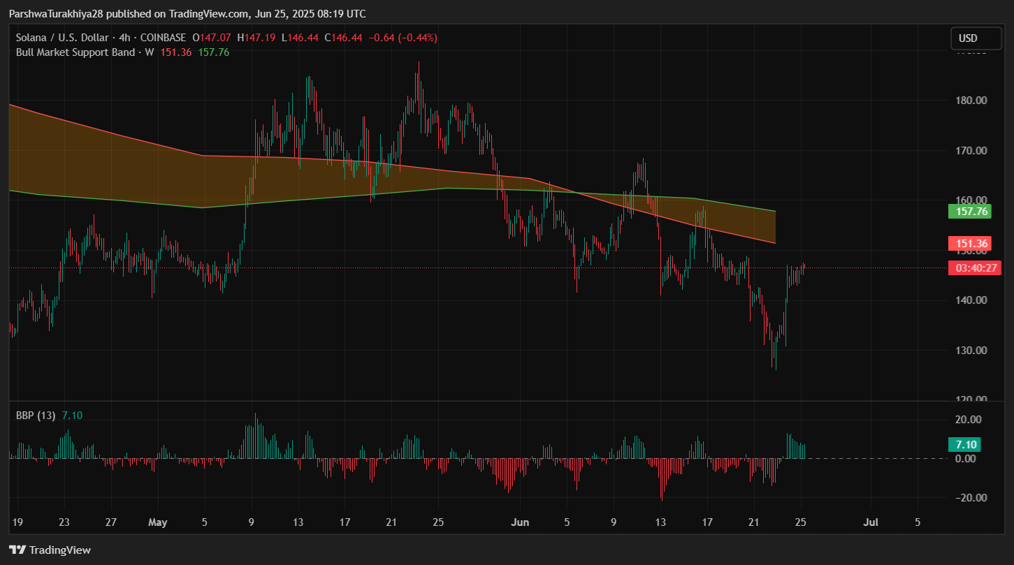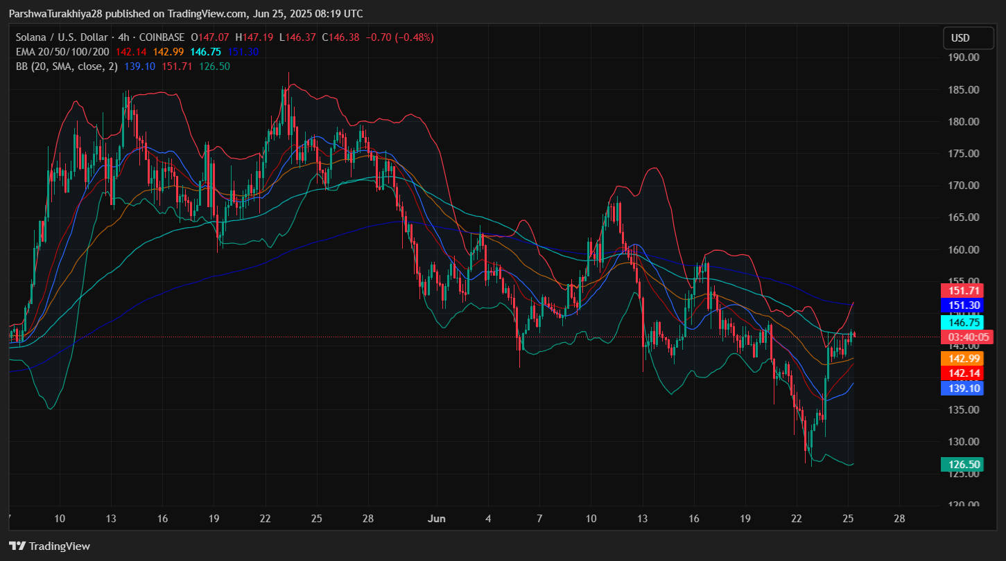 The Solana price bounced aggressively from the $126.50 lower Bollinger Band support on June 22, forming a V-shaped recovery into the $146 zone. On the 4-hour chart, SOL is now pressing against a confluence of resistance, including the 100 EMA ($146.75), 200 EMA ($151.30), and the upper Bollinger Band ($151.71).