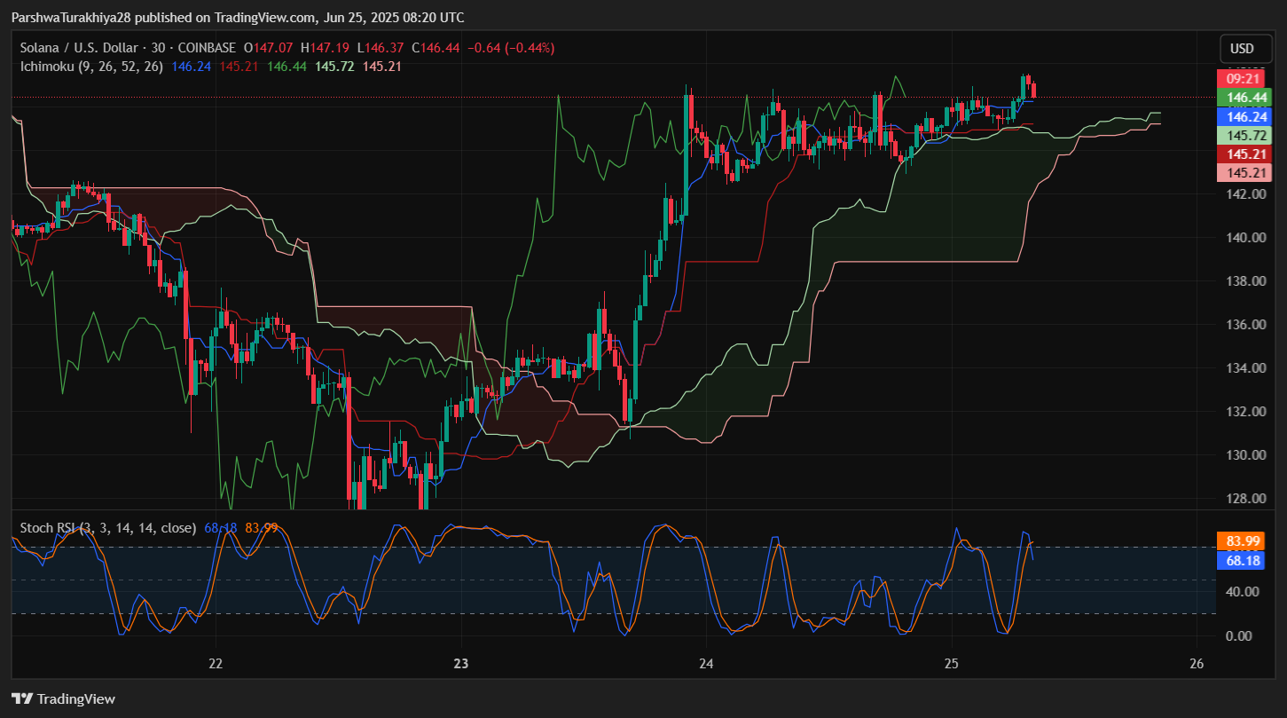 Ichimoku Cloud on the same timeframe shows price trading above the cloud with a bullish twist. Tenkan and Kijun lines are both supportive near $145.21. Stoch RSI, however, is entering overbought territory (currently 68.18 and 83.99), suggesting momentum may cool unless a breakout follows.