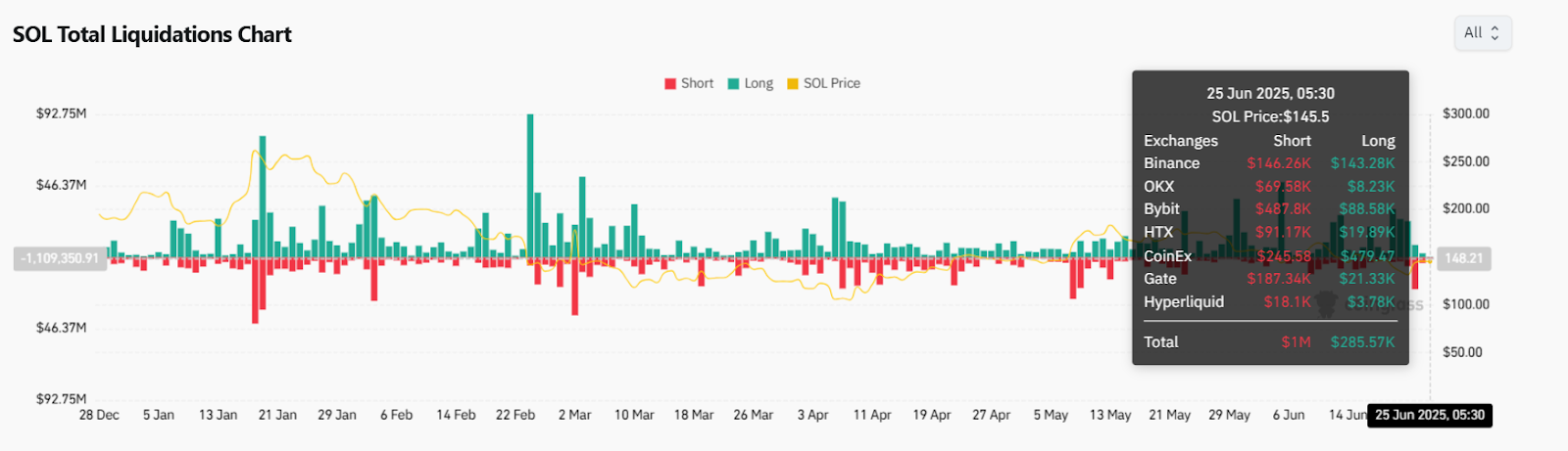 The current rally in Solana price today is fueled by a combination of short liquidation pressure and bullish momentum signals. As seen in the liquidation chart, more than $1 million in shorts were wiped on June 25, with nearly $285,000 in long positions added during the same window. This imbalance indicates aggressive short covering, a common driver of fast-paced Solana price spikes.