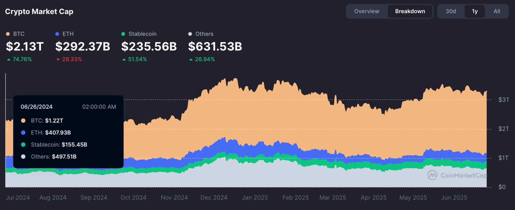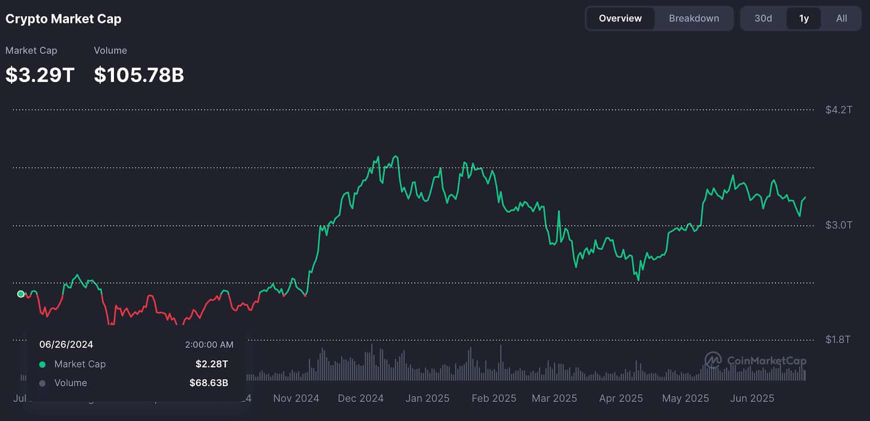 The global cryptocurrency market has added $1 trillion in value over the past year, climbing from around $2.28 trillion last June to $3.29 trillion on June 25, as revealed by data sourced from CoinMarketCap and analyzed by Finbold.