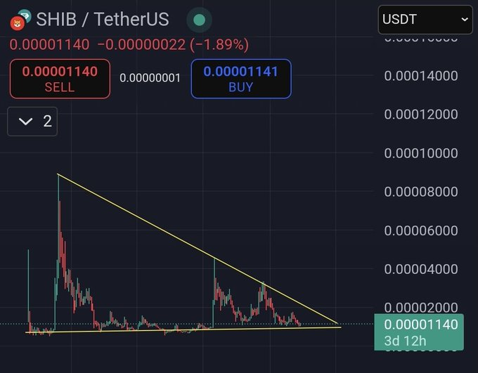 Shiba Inu price continues to hover around a crucial support level at $0.00001140, forming the base of a descending triangle.