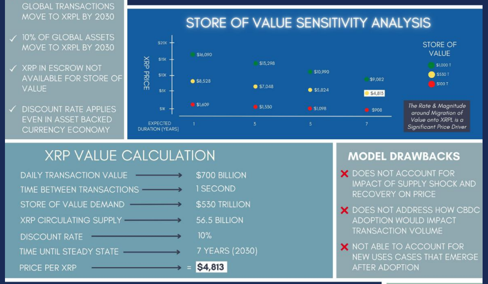 According to the model, store-of-value demand could reach $530 trillion. Even a conservative adoption scenario assuming 10% of global transactions utilize XRP Ledger (XRPL) by 2030 results in the $4,813 price forecast. The mechanics behind the model include: