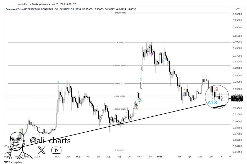 Dogecoin’s 3-day candlestick timeframe chart shows that the meme coin is currently trading just above an ascending trendline that dates back to late 2023, which has acted as a key support level across multiple correction cycles. Despite the recent volatility, the price structure appears to be ready for a possible bounce move from here due to the formation of less volatile candlesticks and higher lows just above the 0.5 Fibonacci retracement level around $0.165.