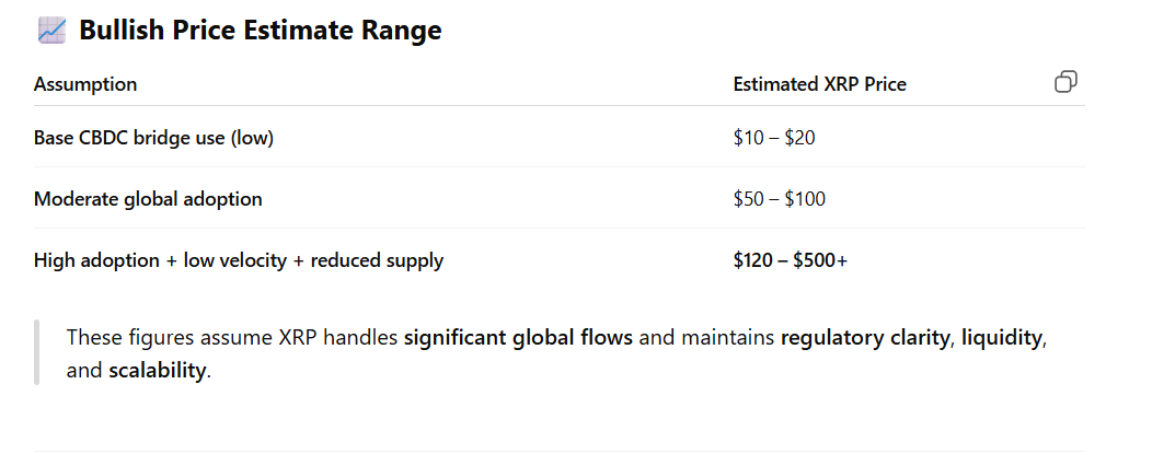 However, the impact on price remains uncertain. To explore what XRP could be worth if it took on the role of a global CBDC bridge, we asked ChatGPT for an estimate based on market data and reasonable assumptions.