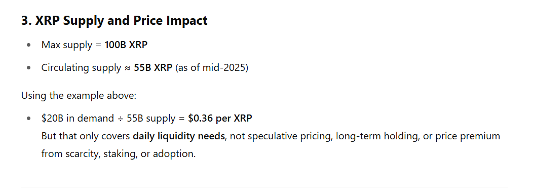 If each XRP moves five times daily, and the volume reaches $100 billion, the system would need $20 billion worth of XRP available at any given time. Spread across the current circulating supply of 55 billion XRP, this creates a base price of around $0.36 per token just to meet liquidity needs.