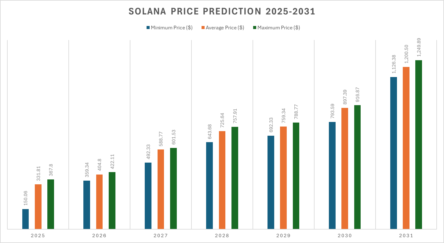Solana’s price is projected to reach a minimum of $1,126.38 in 2031. Expert findings suggest that it could reach a maximum of $1,249.89 and an average forecast price of $1,200.50.