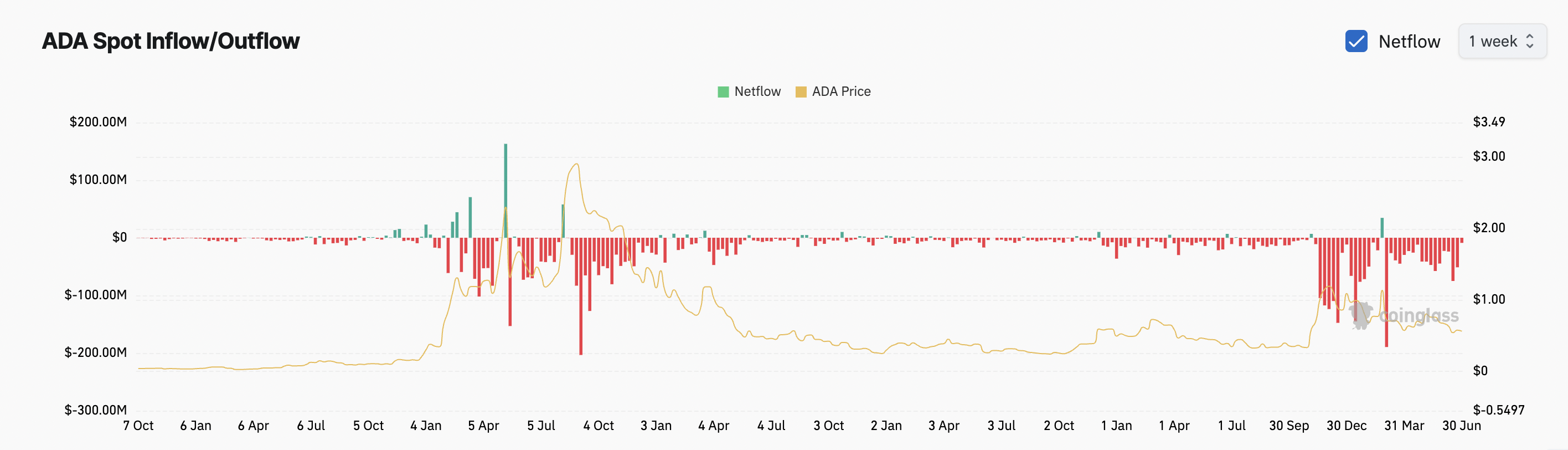 However, despite these developments, ADA’s price performance has remained lackluster. Data from CoinGlass shows that the coin has recorded consistent weekly outflows from spot markets since February, signaling persistent selling pressure and declining investor interest.