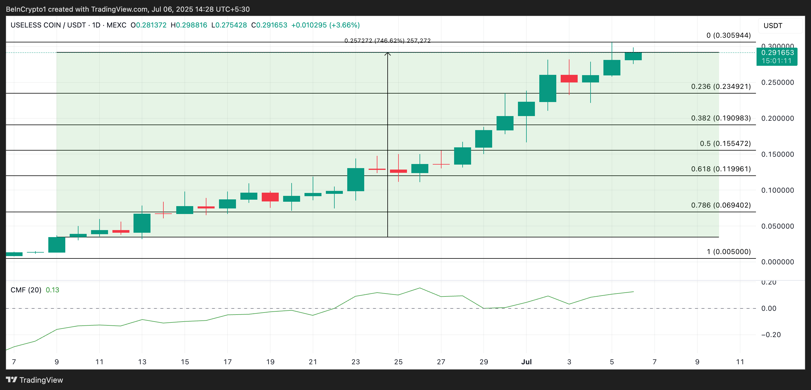 The token’s rising Chaikin Money Flow (CMF) confirms that USELESS’ price rally is backed by significant buy-side pressure. This momentum indicator, which measures how money flows into and out of an asset, is at 0.13 and rising.