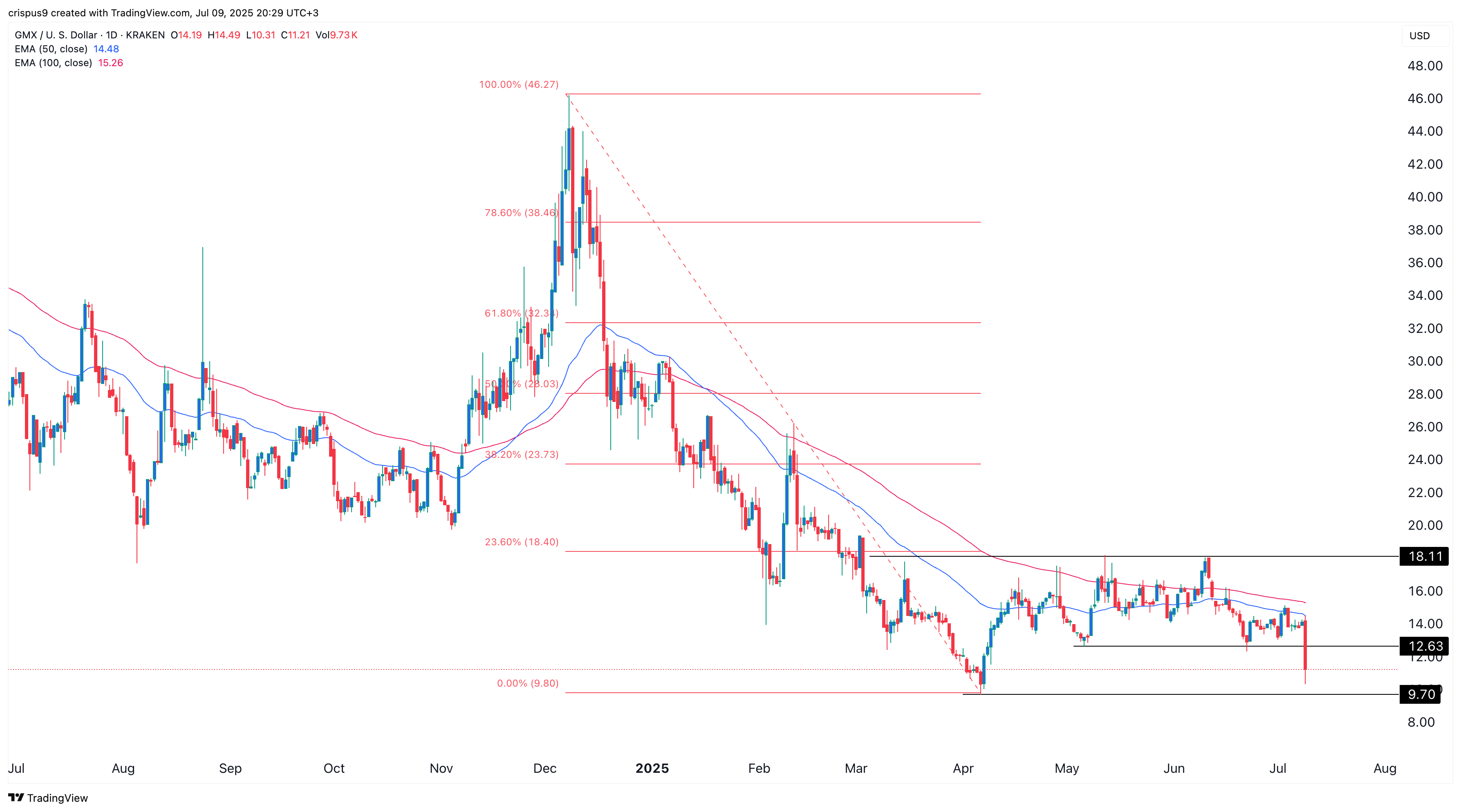Since then, the token has broken below key support at $12.63, a level that previously held on May 6 and June 23. GMX also fell beneath both the 50-day and 100-day moving averages, further reinforcing bearish momentum.
