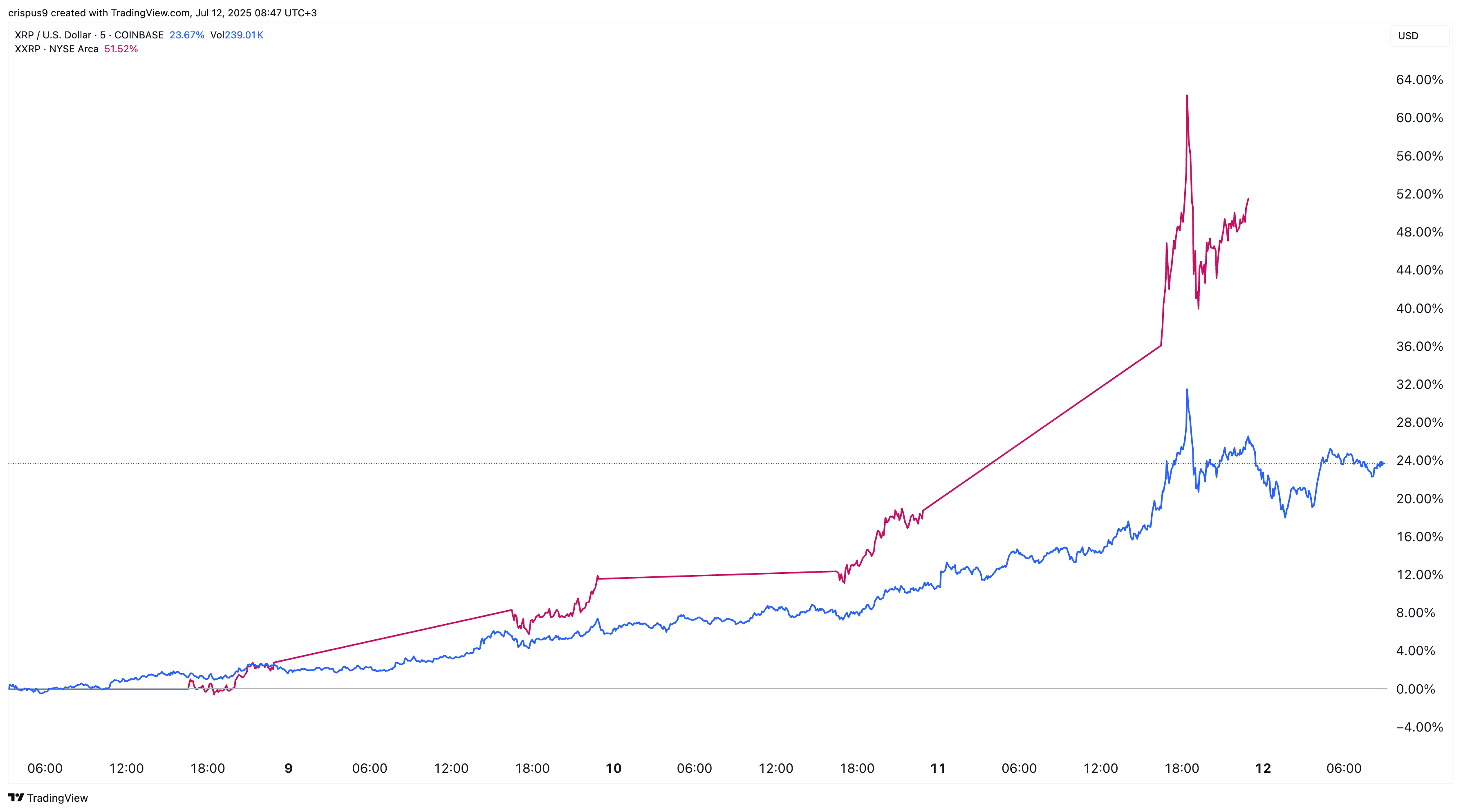 The XXRP ETF aims to compensate for the high fees by offering twice the daily return of Ripple’s price. For example, XRP price jumped by 24% in the last five days, while the XXRP stock jumped by 51% in the same period.