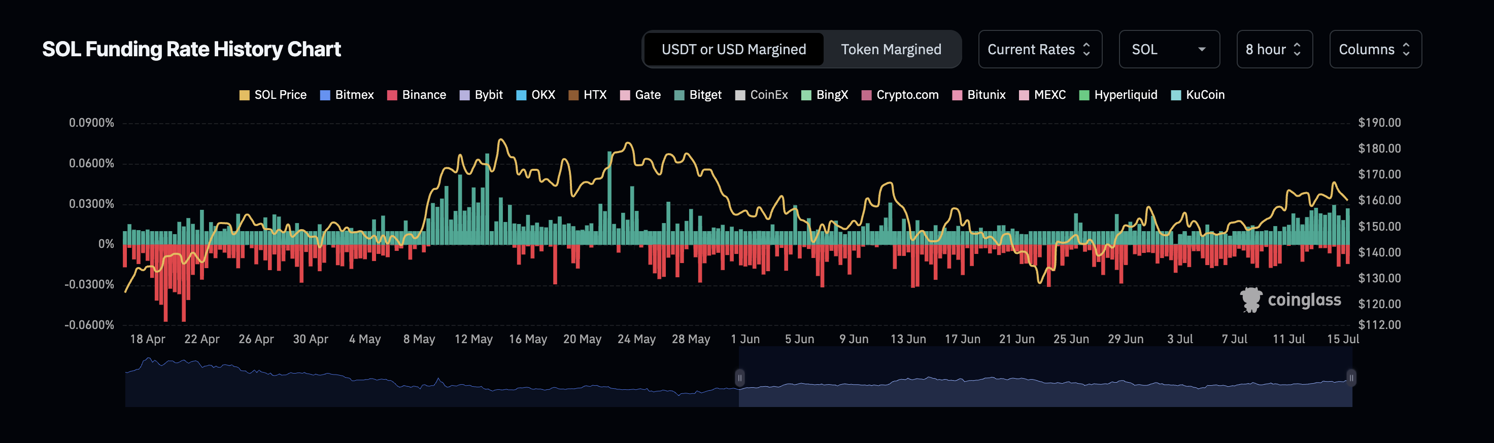Solana’s funding rate bars are still green, indicating that long positions are dominant across the market. Even as the price dipped slightly, traders are still paying a fee to stay long, which means most expect the price to rise again.