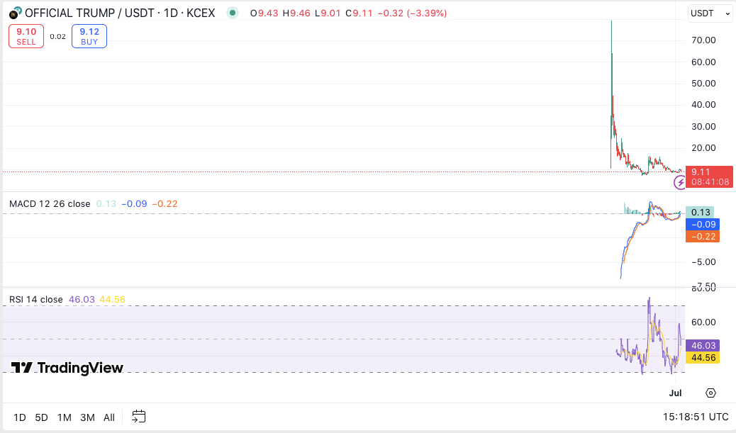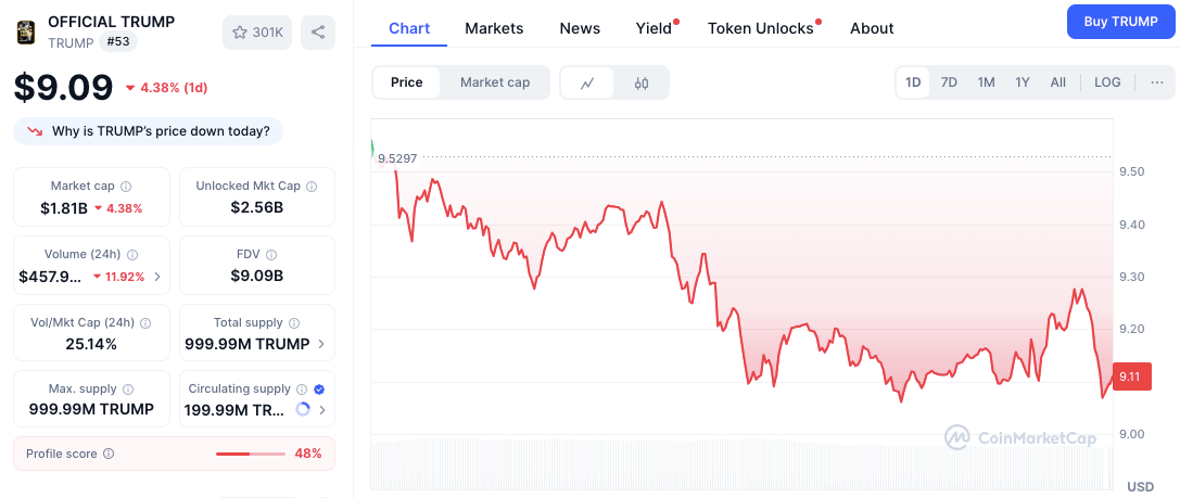 TRUMP as of press time is trading at $9.09, marking a daily decline of 4.42%. The price opened near $9.53 today’s intraday high but quickly faced rejection.