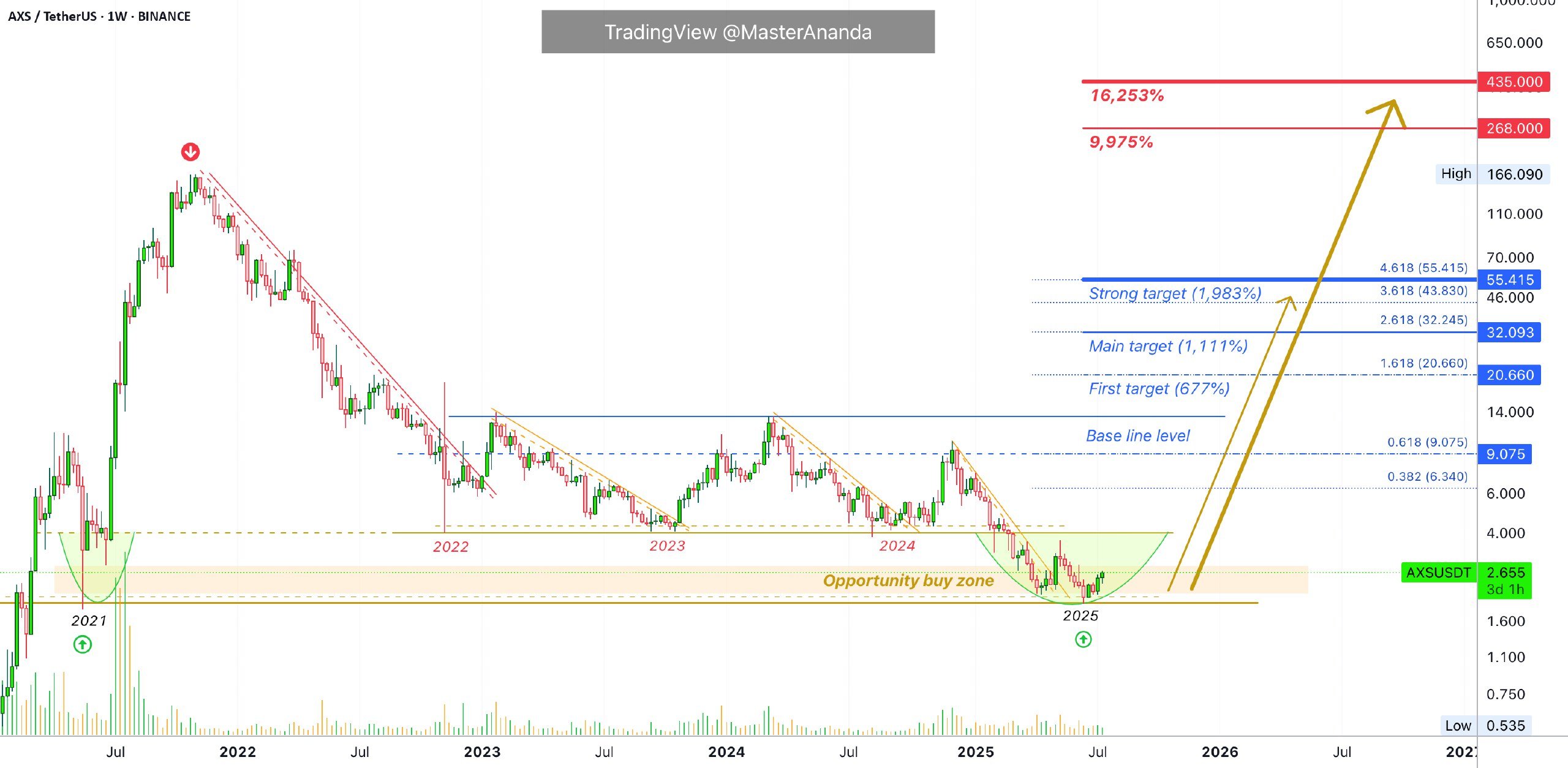 - Axie Infinity is now in an opportunity buy zone, just below multi-year support from 2022 to 2024.