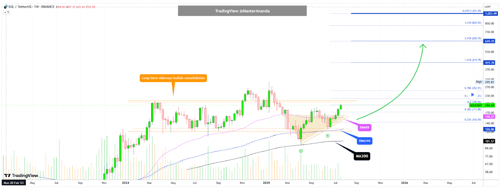 SOL is now trading above the 55-day EMA, 144-day EMA, and 200-week MA, confirming a strong trend reversal. Fibonacci extension levels point to upside targets at $252.91, $419.78, $620.35, and $1,021.49.