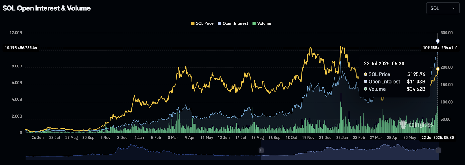 At the same time, strong on-chain metrics are also fueling Solana’s momentum. Notably, the asset reclaimed the $200 level as Open Interest hit a record $11.03 billion on July 21, up from $9.52 billion just days earlier, according to Coinglass.