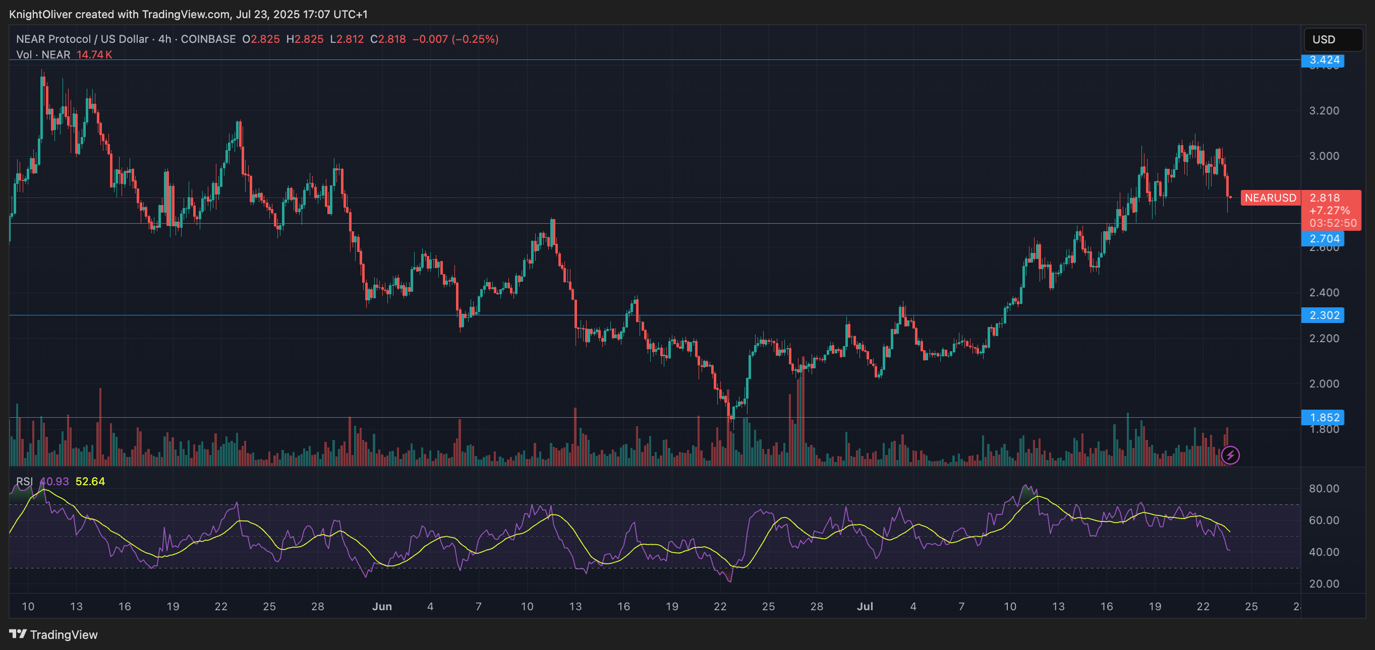 - Price Action: $NEAR fell 5.41% from $2.97 to $2.81 (July 22–23), with a trading range of $3.04 (high) to $2.76 (low).