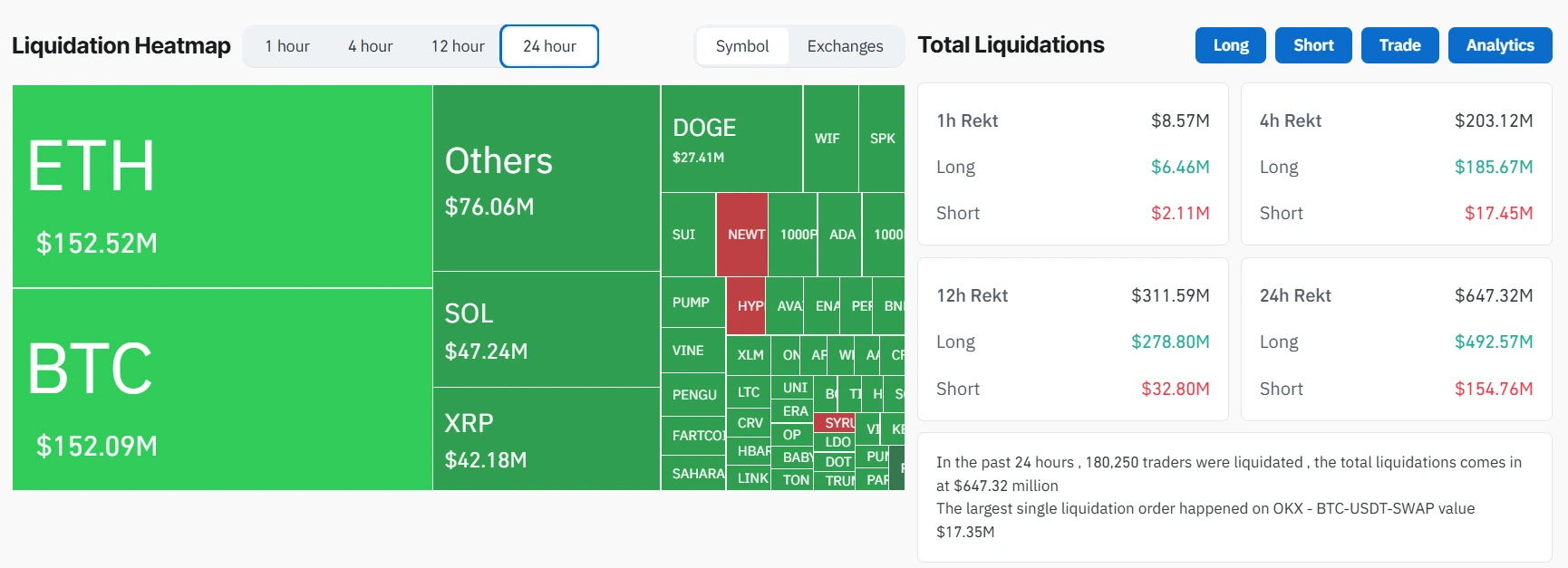 Over $647M liquidated in 24 hours, ETH and BTC saw $150M+ each wiped out