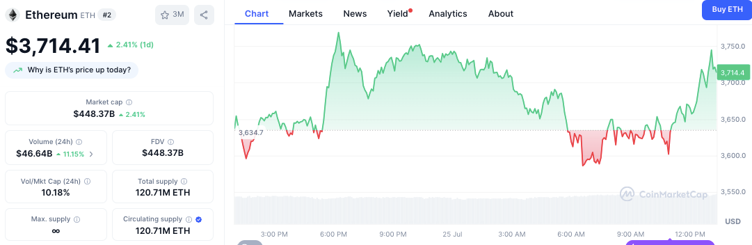 Though the meme coin market witnessed slight ups, Ethereum outperformed them rising 2.41% to $3,714.41. The network’s market capitalization reached $448.37 billion. Additionally, the trading volume climbed by 11.15% to $46.64 billion, boosting the volume-to-market-cap ratio to 10.18%.