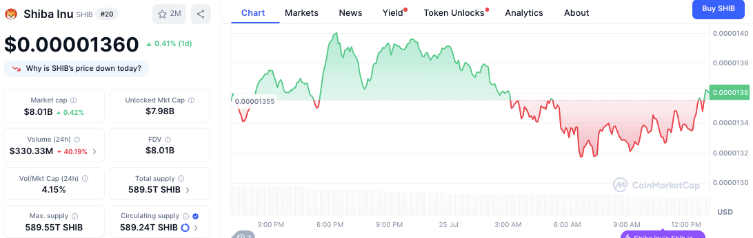 Shiba Inu, trading at $0.00001360, recorded a daily gain of 0.41%, while its market capitalization stood at $8.01 billion. However, with a dip in its trading activity, the 24-hour trading volume fell to $330.33 million, down 40.19%, bringing the volume-to-market-cap ratio to 4.15%.
