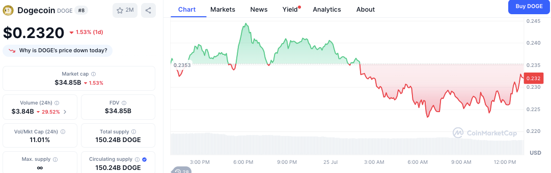 Intraday data shows that DOGE peaked at $0.2353 before reversing direction, dipping toward $0.225 in early trading. A small recovery later brought it back to $0.232 by midday.