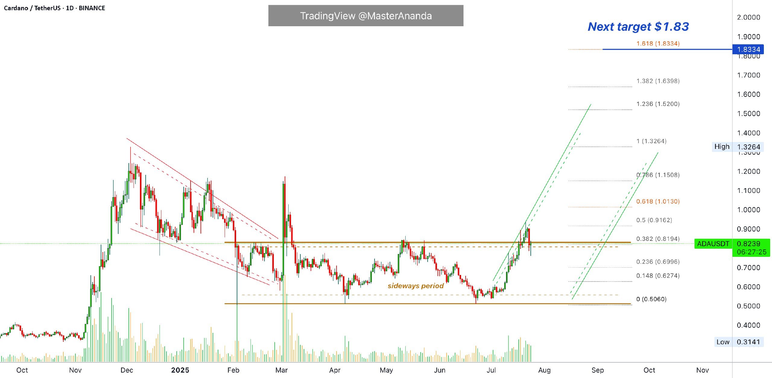 - Cardano is trading at $0.82 but could surge past $4, with $7–$8 also possible, says a popular crypto analyst.