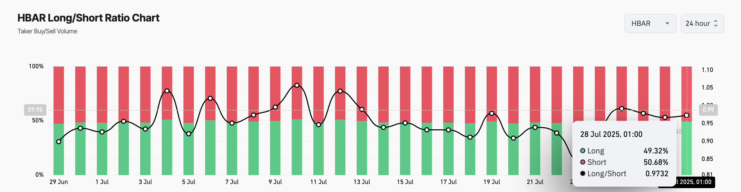 On the other hand, as is the case with HBAR, a ratio under one means more traders are betting on a price decline than on a price increase. This reflects growing skepticism around the altcoin’s short-term price outlook, as more traders attempt to lock in gains.