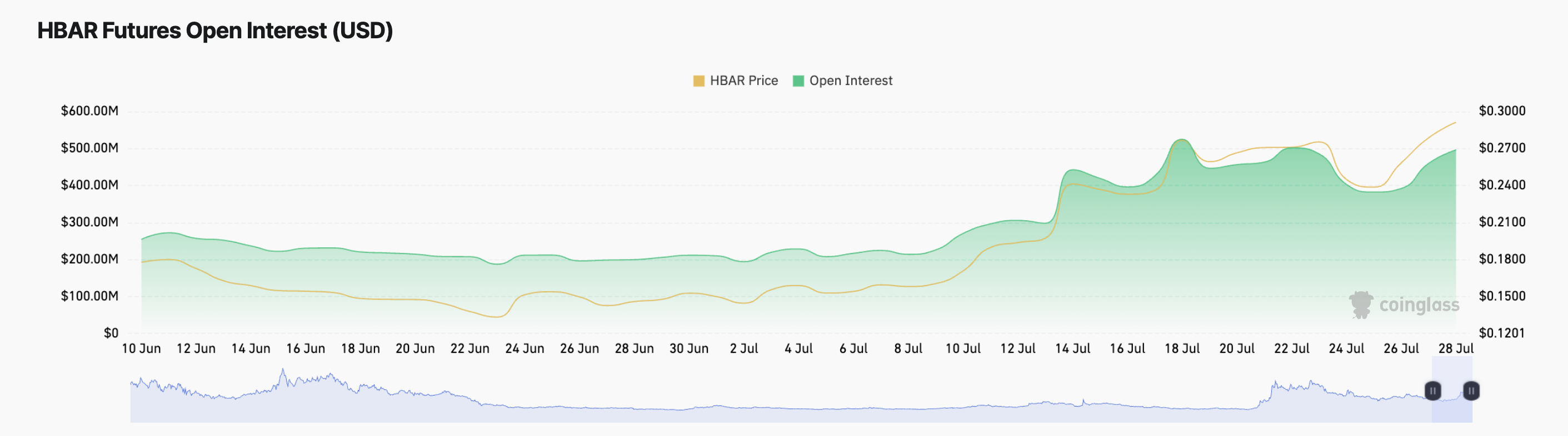 According to Coinglass, HBAR’s open interest has increased by 8% in the past 24 hours, reaching $497 million, even as the token’s price trends downward. This is typically viewed as a red flag, as it indicates that more futures positions are being opened, betting on further declines.