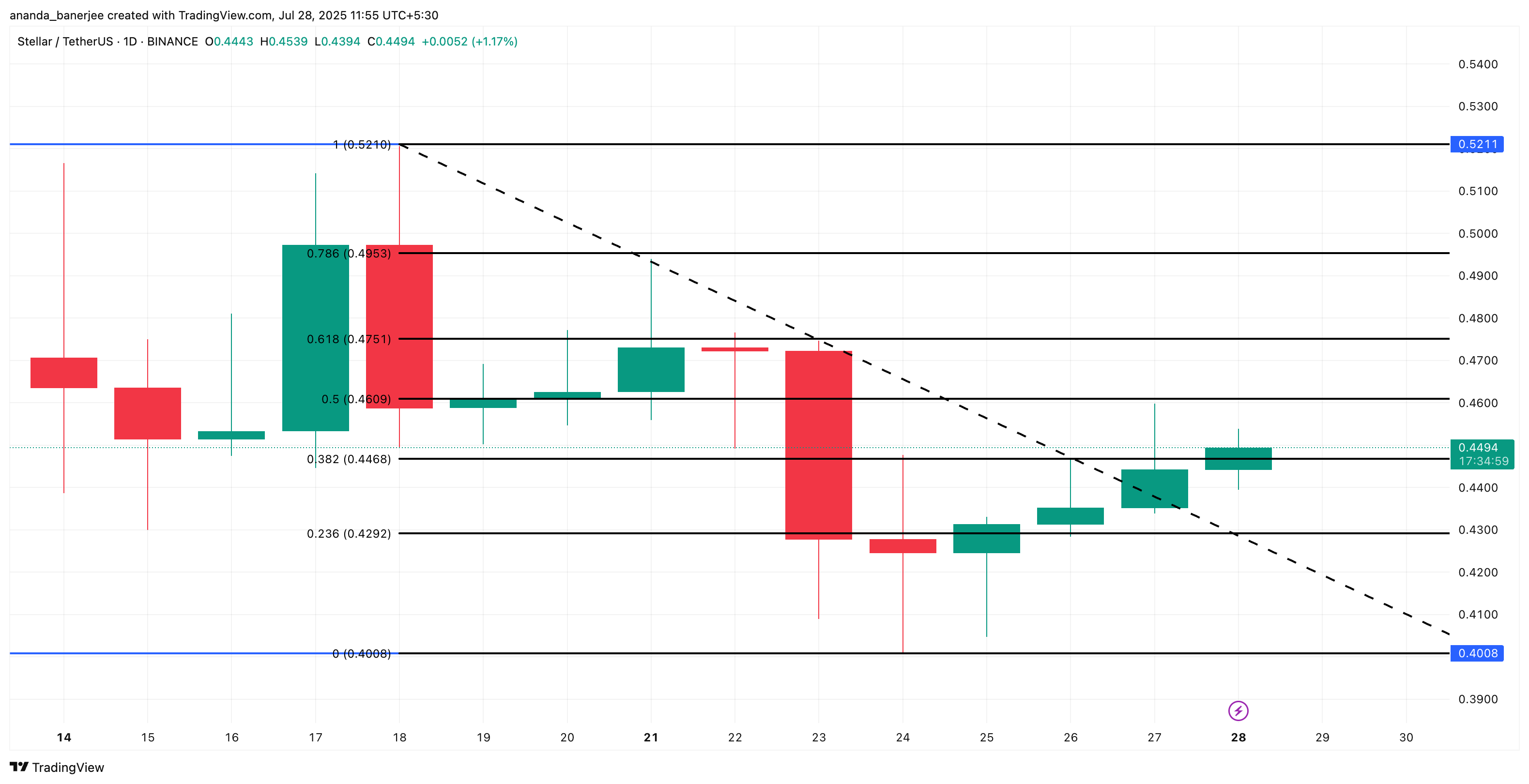 Despite signs of reversal, the Stellar (XLM) price has yet to clear key technical levels. The $0.46 zone—corresponding to the 0.5 Fibonacci retracement from the $0.52 swing high to the recent $0.40 low—remains a stubborn ceiling.