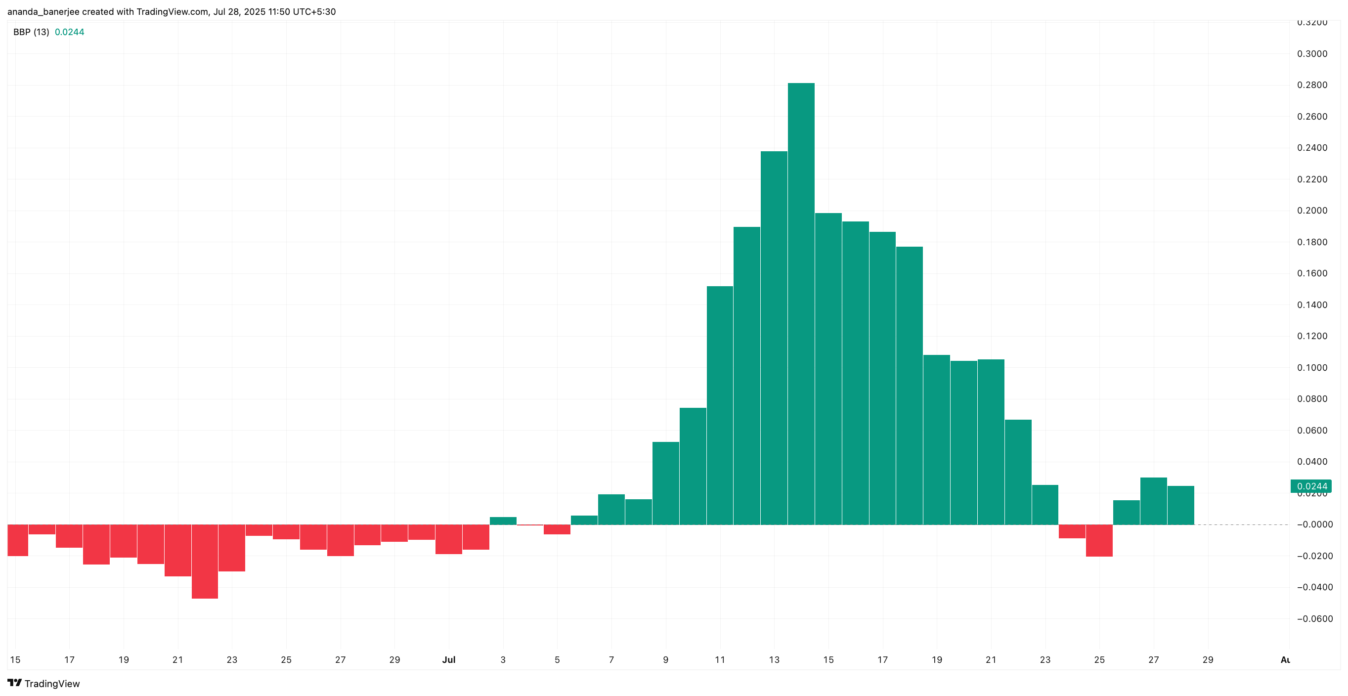 After a couple of days of bearish strength, BBP has just crossed into positive territory. While the bulls haven’t taken over convincingly, this flip shows that downside momentum may be weakening. Sellers no longer have full command, and the slow reappearance of buyer dominance could be the first stage of a price action reversal.