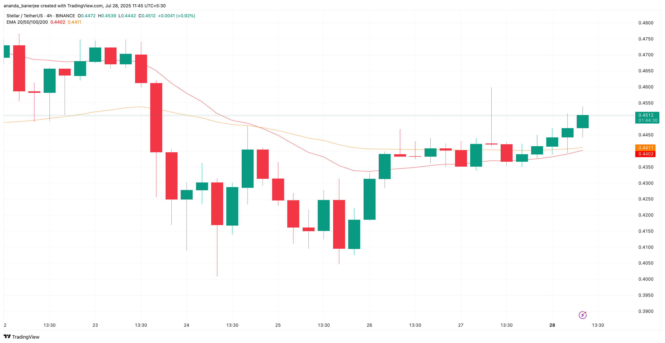 Short-term trends often surface first on lower timeframes, and Stellar (XLM)’s 4-hour chart shows a potentially critical development. The 20-period Exponential Moving Average (EMA), the blue line, is inching closer to the 50-period EMA (orange line), teasing a bullish crossover that could attract fast-moving traders.