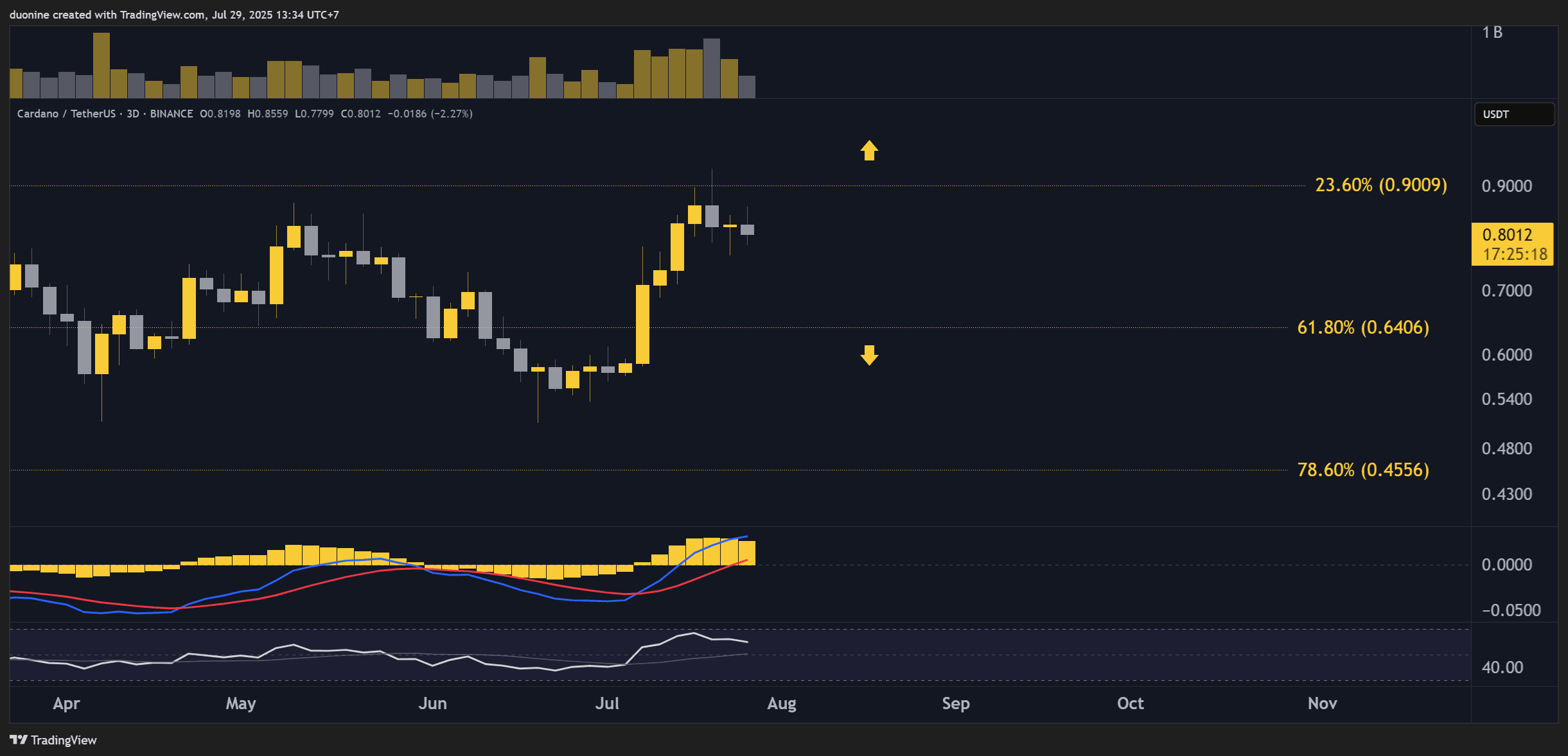 With buyers less interested in the past week, the price struggled, and this can be seen on the chart. The volume profile also shows a significant drop, with sellers dominating. This indicates a lack of interest in Cardano right now, but this can change if the $0.80 support holds.