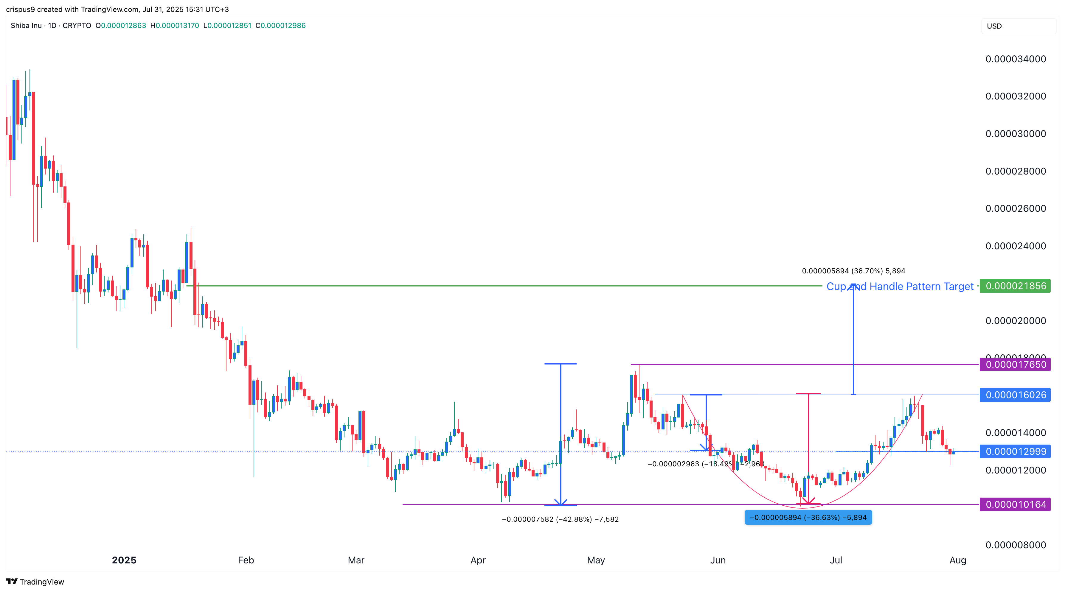 The ongoing pullback is part of the handle section of the cup-and-handle pattern. Measuring the cup’s depth of 36% from its upper side gives a target price of $0.00002185, up over 70% from the current level.