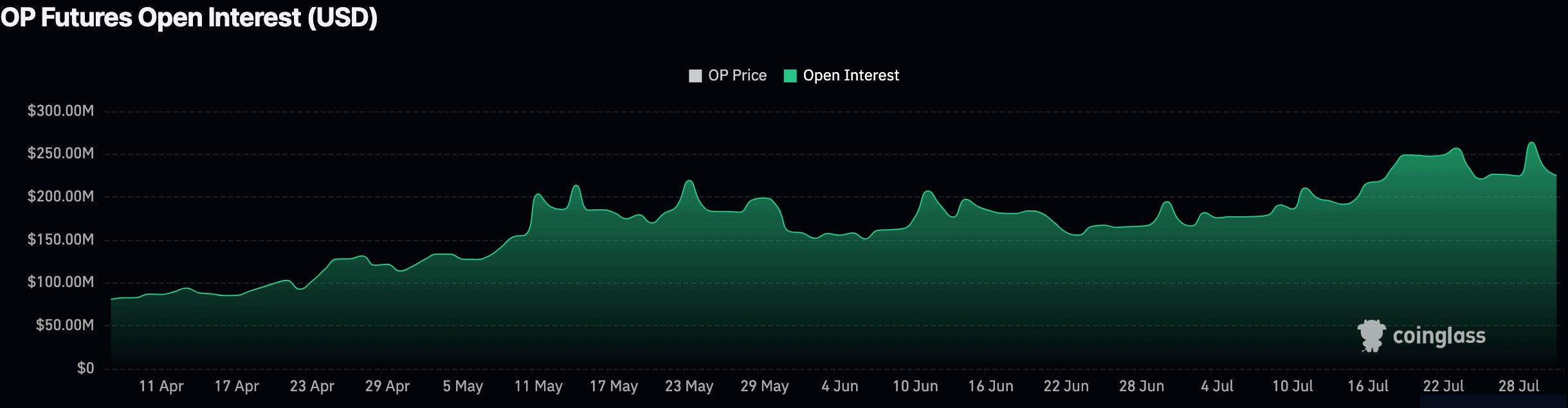 Open Interest (OI) in OP futures has grown 6% in the past day, reaching $234 million, based on Coinglass data. Since April, open interest has grown steadily, more than doubling from earlier levels.