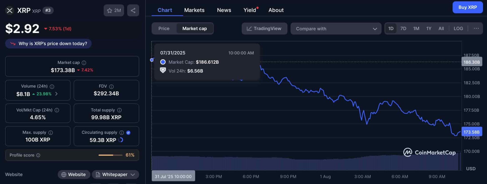 The sell-off, which also rattled equities, combined macroeconomic uncertainty with profit-taking after XRP’s recent highs. In particular, the token fell from an intraday peak of $3.16 to a low of $2.92, wiping out more than $13 billion in market value as its capitalization dropped from $186.6 billion to $173.3 billion in just hours.
