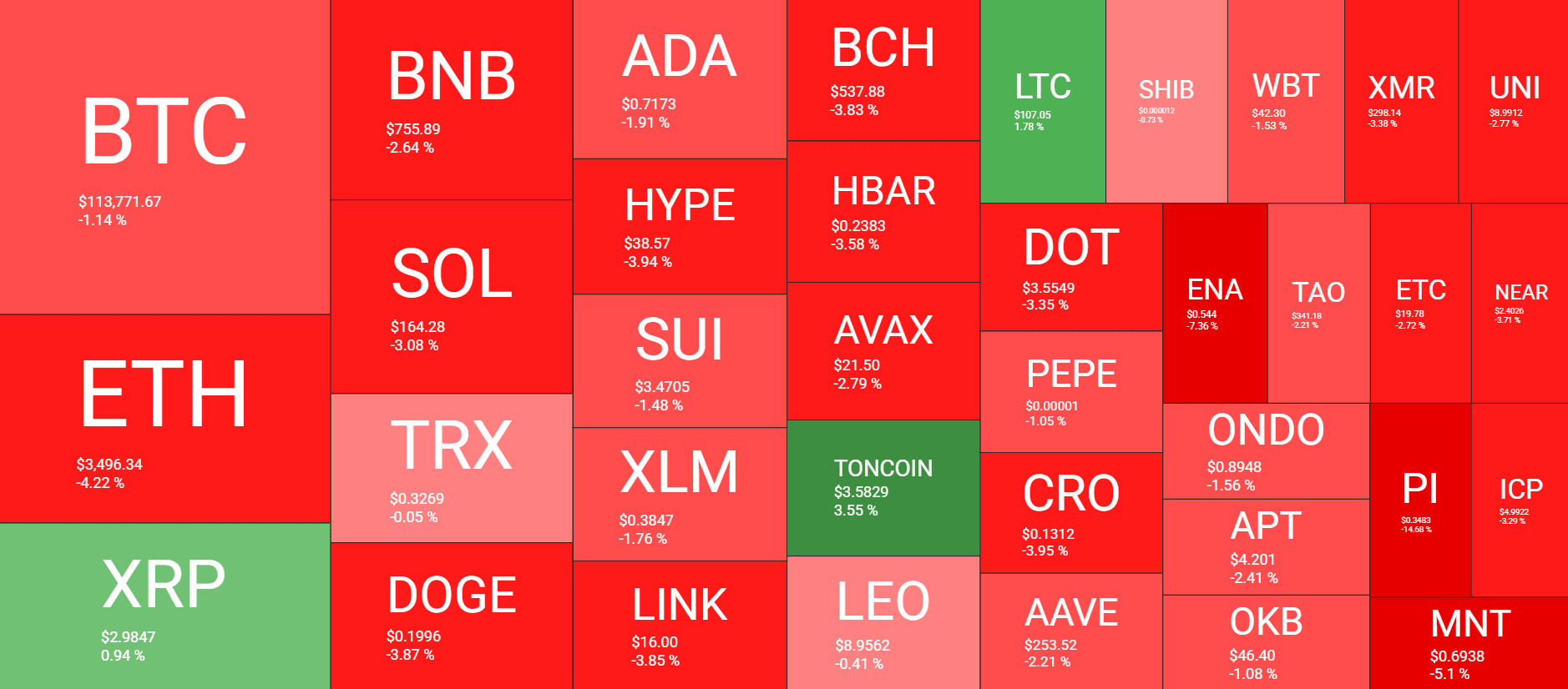 Most larger-cap alts have followed BTC on the way south, with even bigger price declines. ETH has slipped below $3,500 after a 4% daily drop, SOL is below $165, while DOGE, HYPE, LINNK, BCH, and HBAR have retraced by around 3-4%.