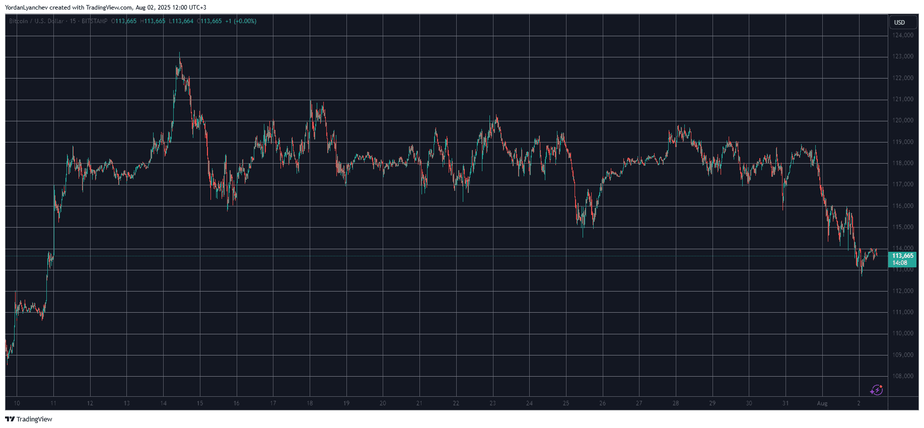BTC reacted with an immediate price slip to under $116,000 but bounced off and challenged $119,000 on Thursday morning. However, more Trump-induced volatility followed amid new tariff developments and nuclear sub movements, and bitcoin plunged below $113,000 on Friday evening for the first time since July 10.