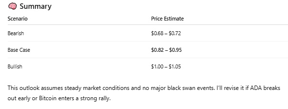 At the same time, ChatGPT cautioned that a drop below Bitcoin’s $105,000 support could push ADA down to the $0.68 to $0.72 range. The base case remains $0.82 and $0.95, with a bullish scenario pointing to $1 and $1.05 if conditions improve.
