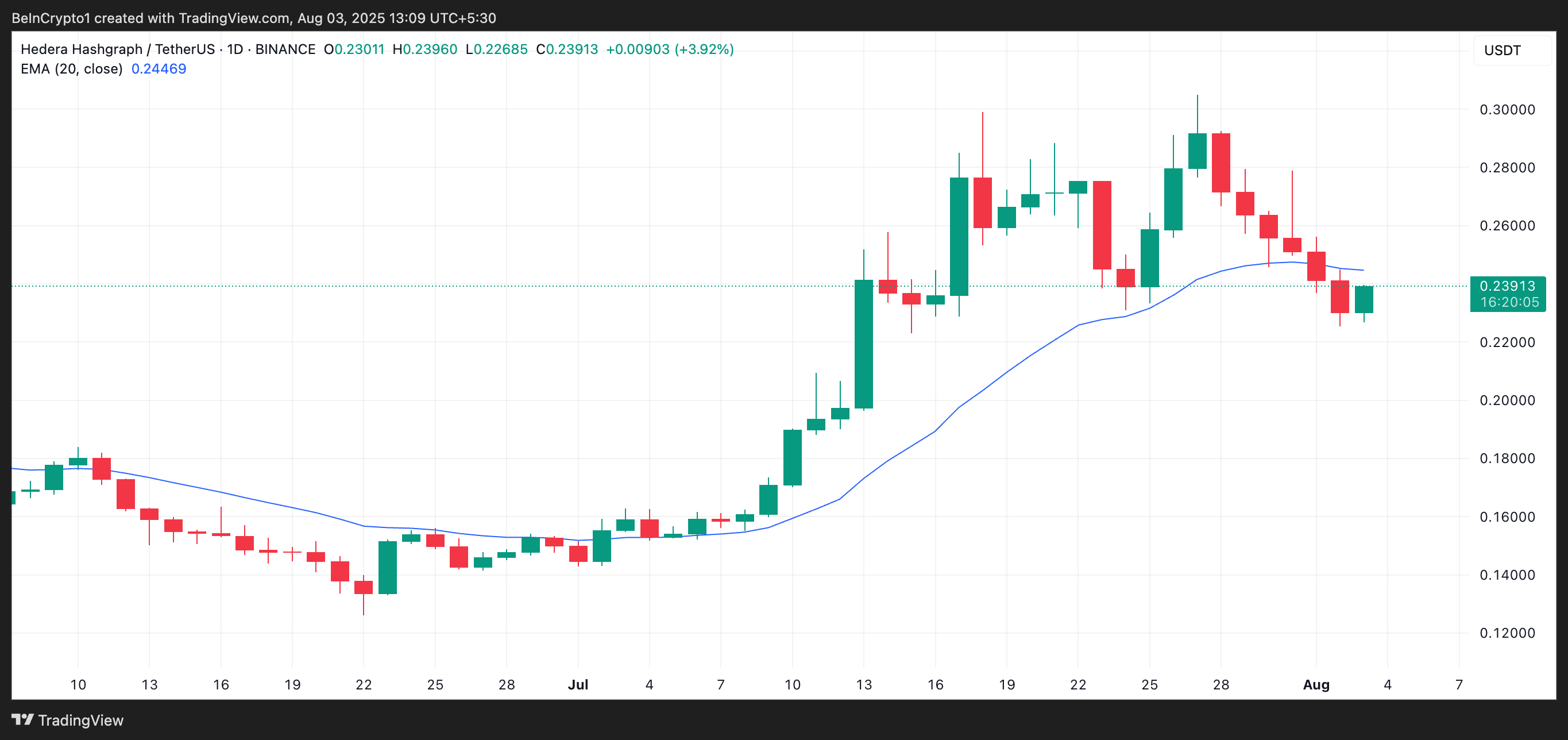 Readings from the one-day chart show that HBAR’s double-digit decline has pushed its price below the 20-day Exponential Moving Average (EMA).