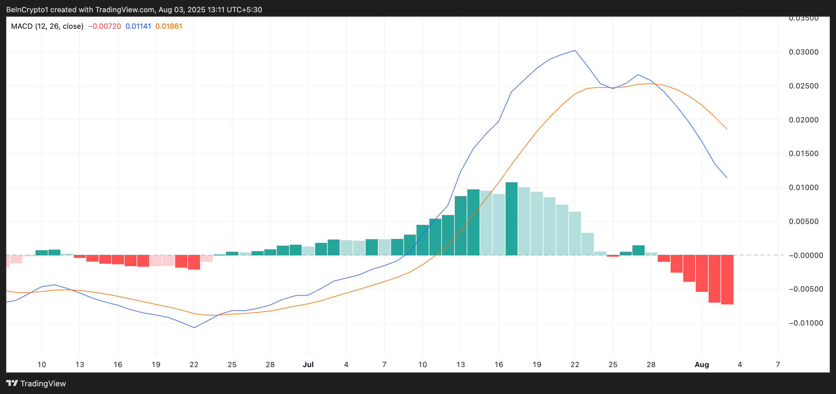 Furthermore, the setup of the altcoin’s Moving Average Convergence Divergence (MACD) indicator supports this bearish outlook.