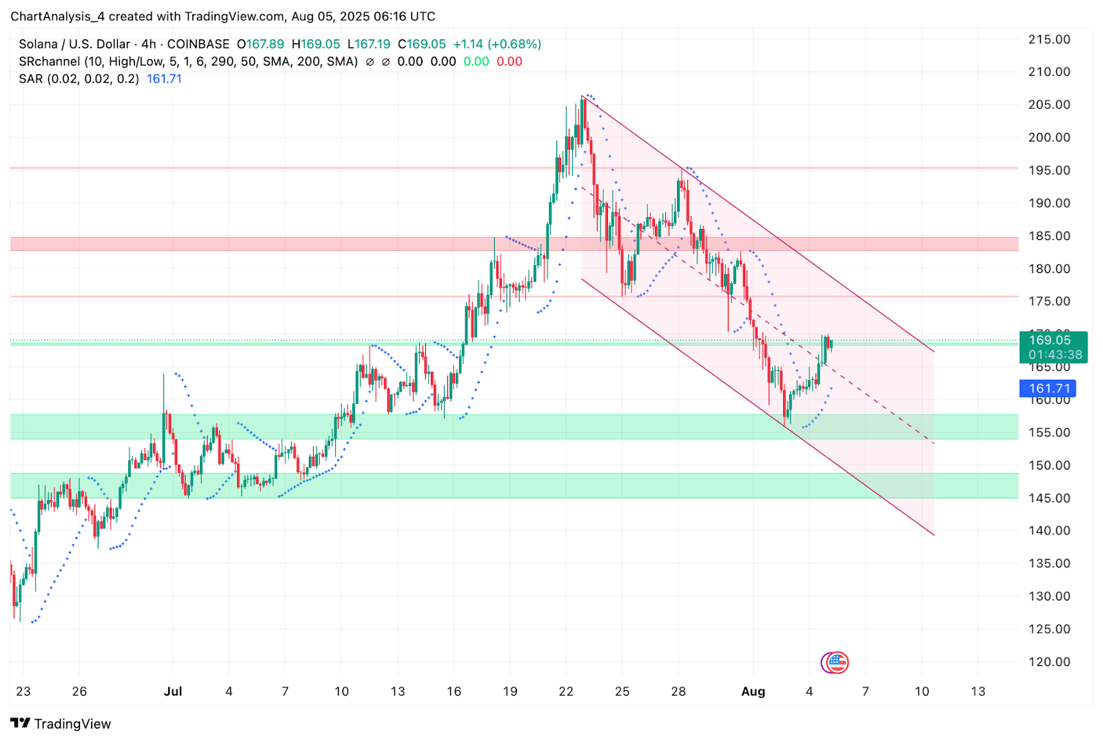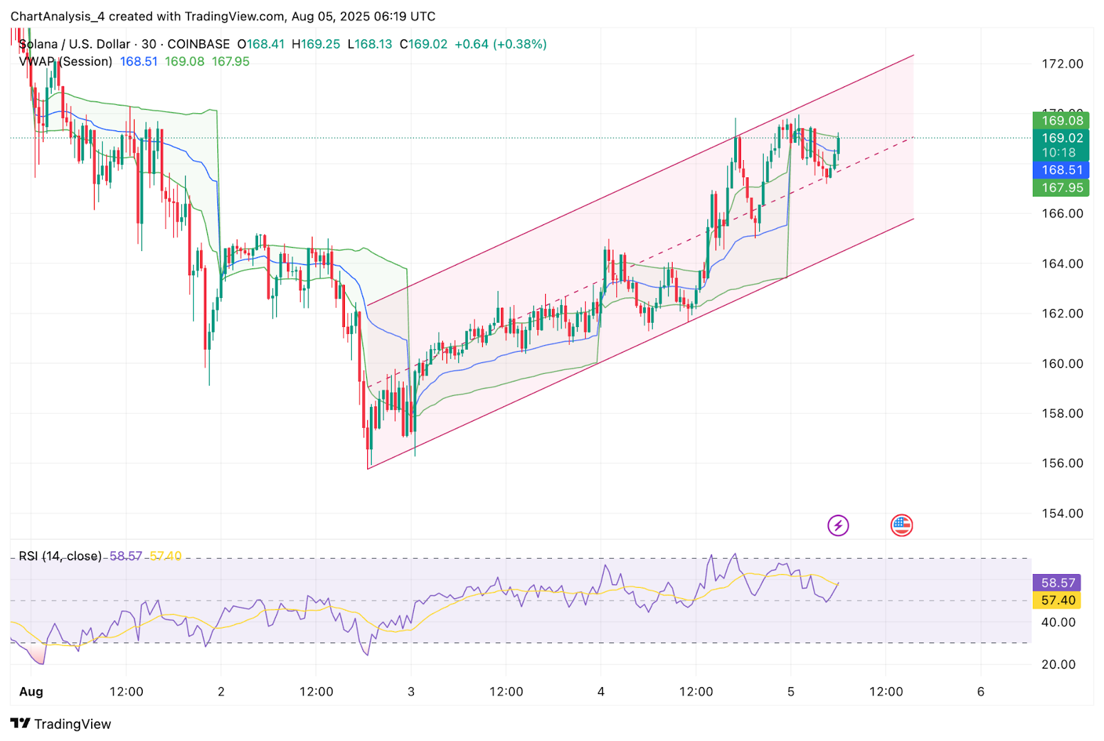 Price is also interacting with the upper boundary of the intraday ascending channel. If this channel holds, SOL may consolidate in a tight range between $167 and $171 before attempting a breakout.