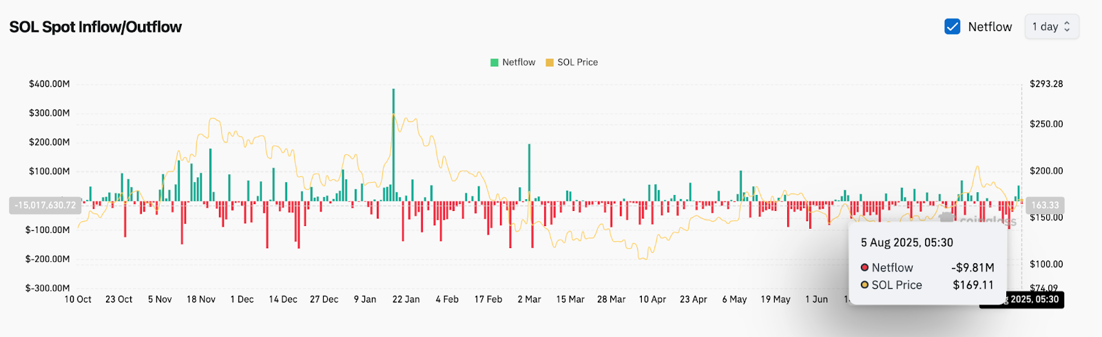 Despite the recovery, net outflows remain negative. Coinglass data shows over $9.81M in net outflows as of August 5, indicating profit-taking or reallocation pressure. This suggests the bounce is not yet backed by strong spot demand.