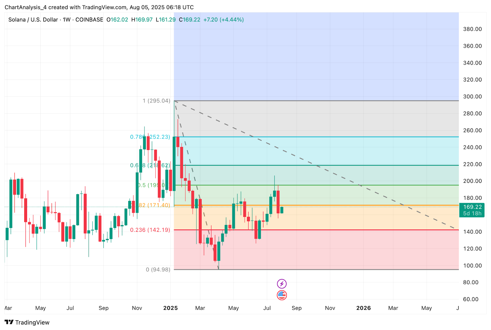 On the weekly chart, Solana price is trading just below the 0.382 Fibonacci retracement level at $171.40, which has rejected price twice in the past three months. This level remains the key trigger for any larger upside continuation. Above it, the next Fib target lies near $195.00 (0.5 level).