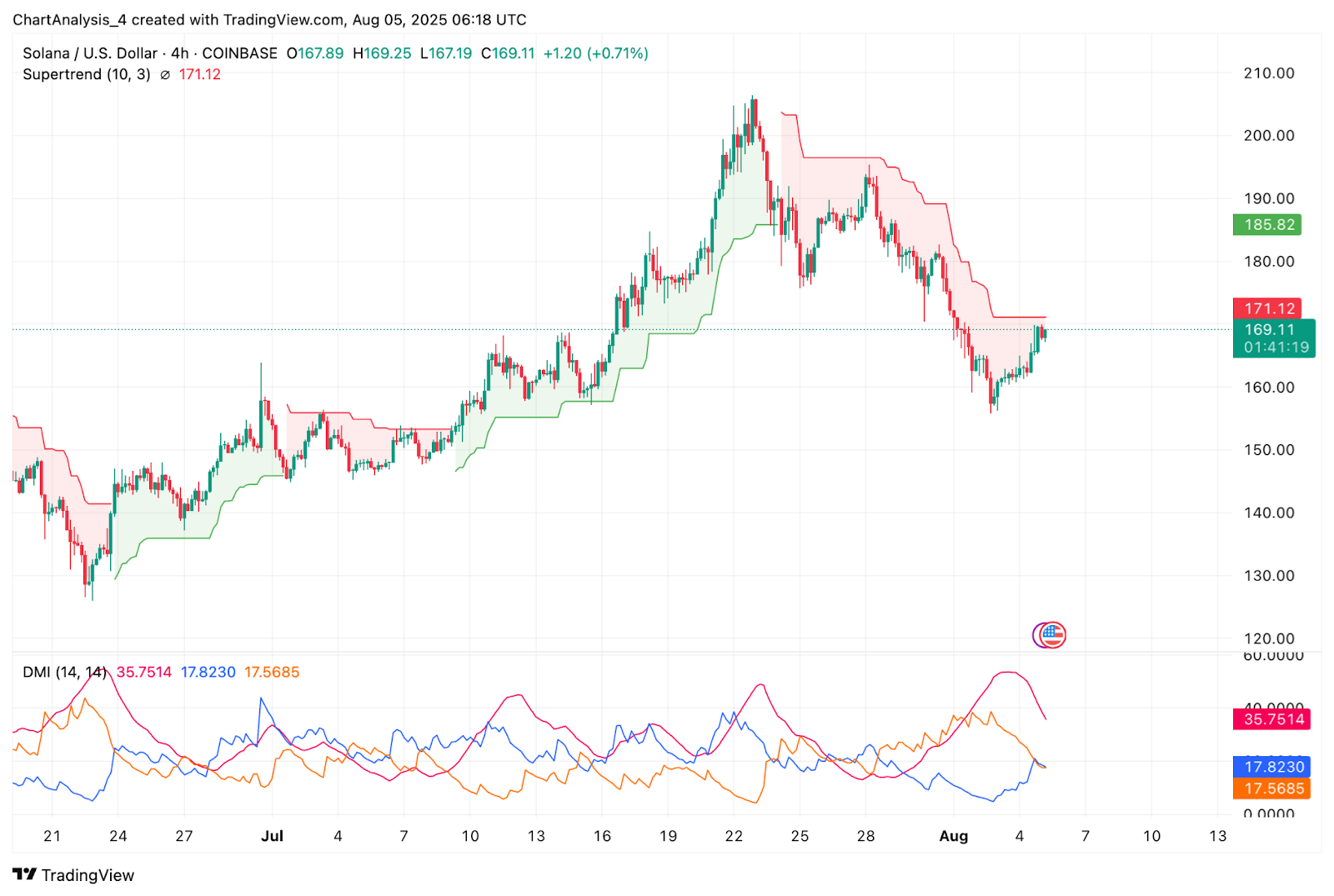 The Solana price today is trading around $169.05 following a short-term bounce from key support near $155. Despite climbing over 6% since August began, SOL now faces resistance from a confluence of technical barriers. Price remains below the Supertrend on the 4-hour chart and the 0.382 Fibonacci retracement level from the November–March swing, with $171.40 acting as the next hurdle for bulls.
