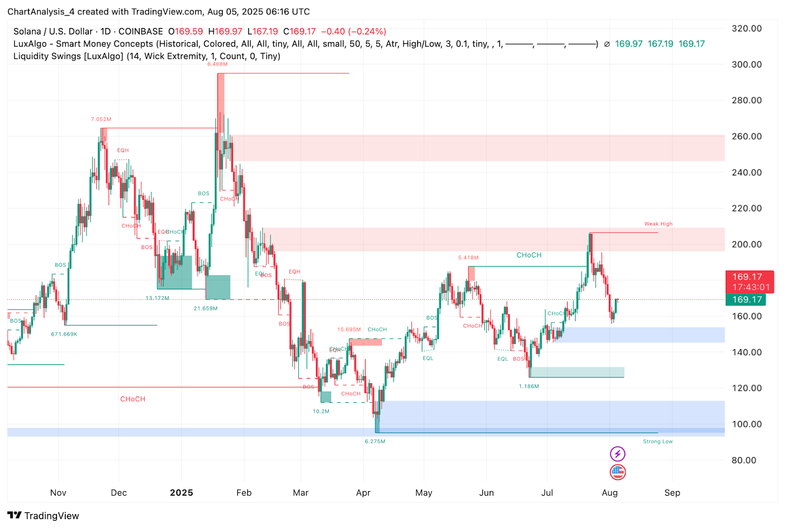 The 1D Smart Money chart confirms that SOL is now approaching the previous Change of Character (CHoCH) zone near $171–$175, a key structural level that could dictate the next breakout or rejection.