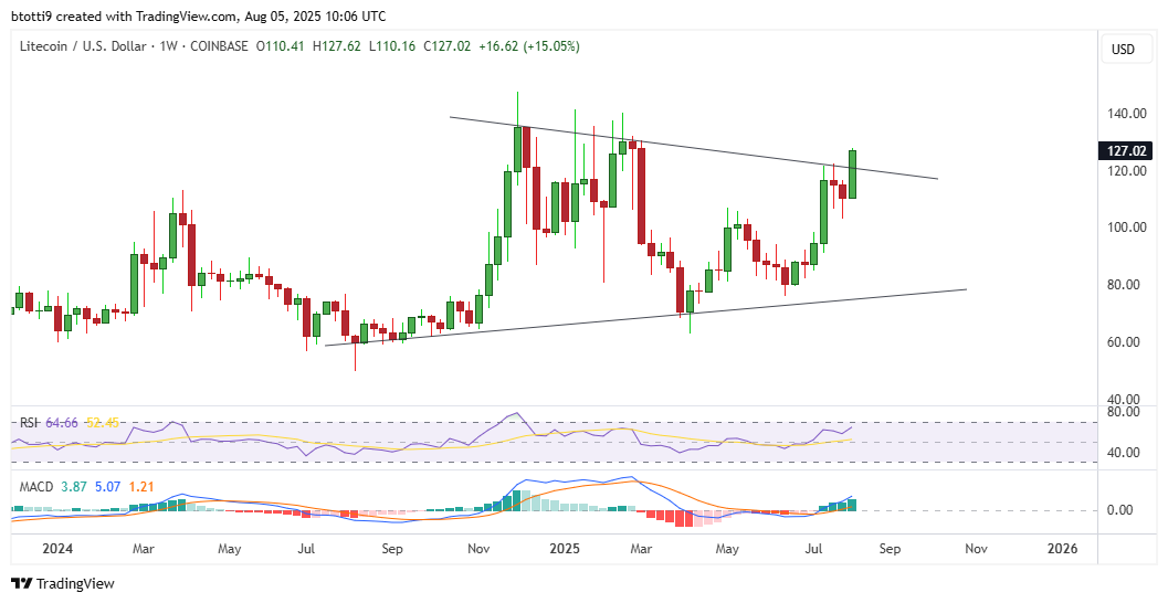 For LTC, the outlook gets a further bullish impetus from a range of factors. It includes overall anticipation of a spot Litecoin exchange-traded fund (ETF) approval, increased use as a payment currency and significant institutional interest amid treasury strategy moves.