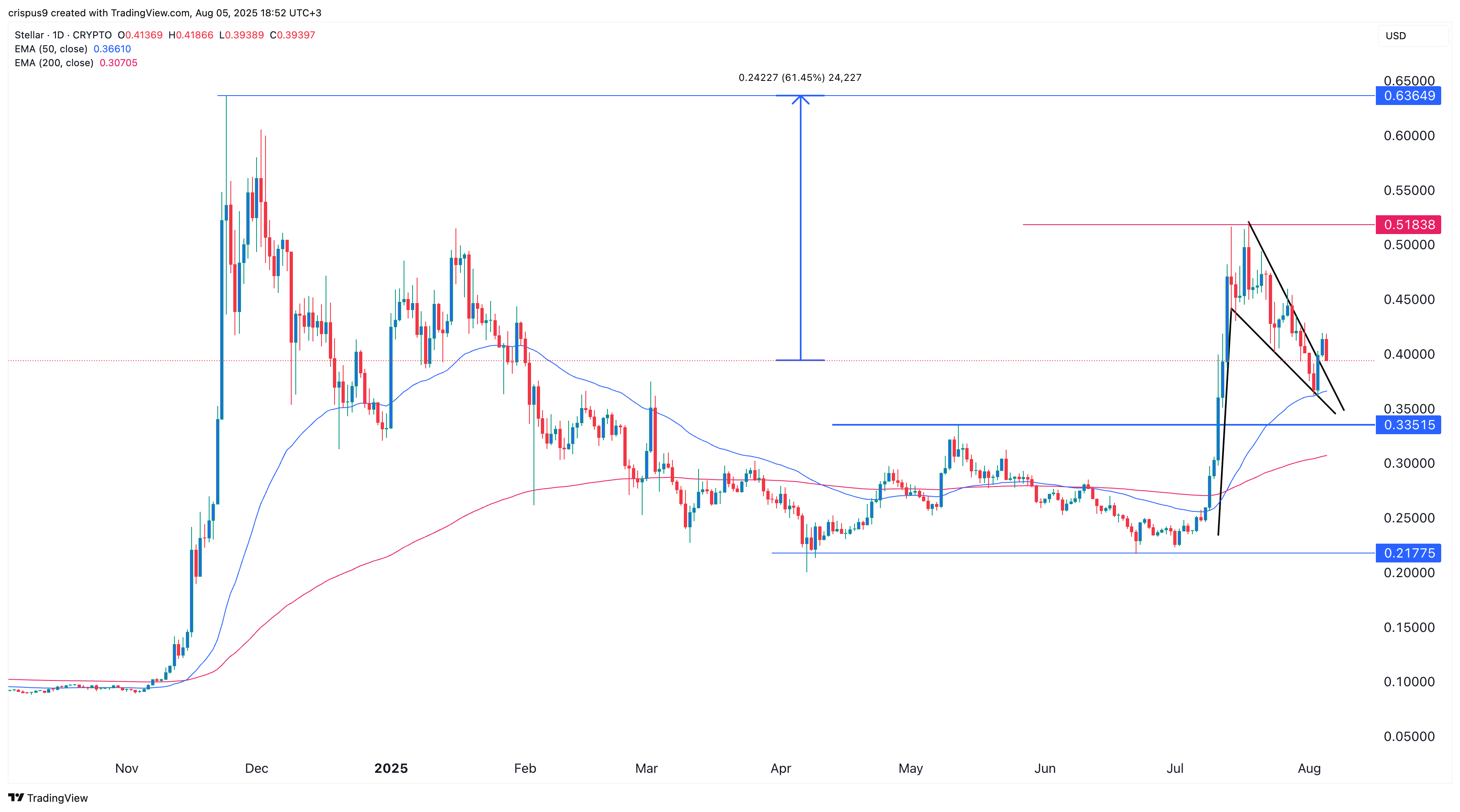 Most importantly, Stellar has formed a falling wedge pattern, which happens when there are two descending and converging trendlines.
