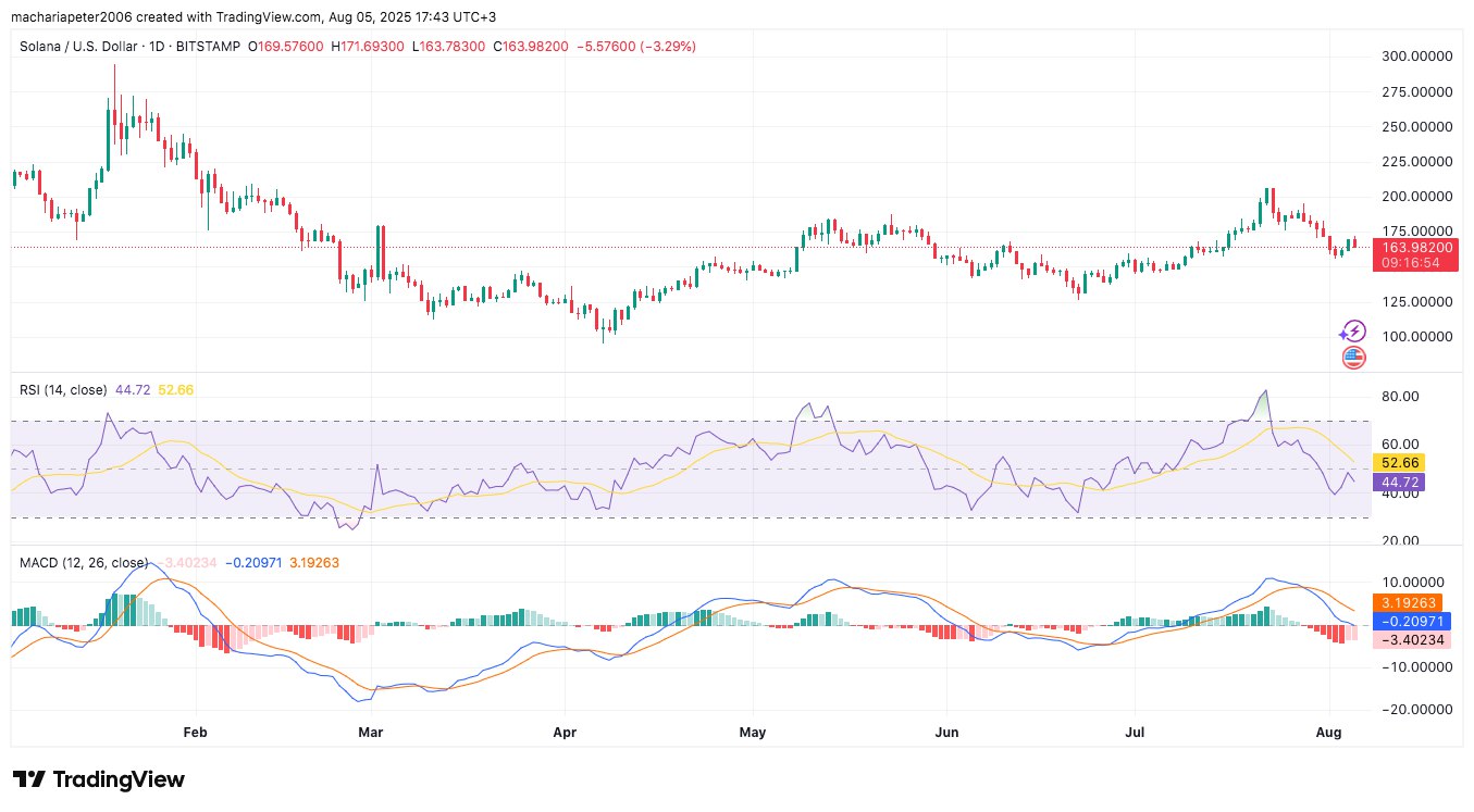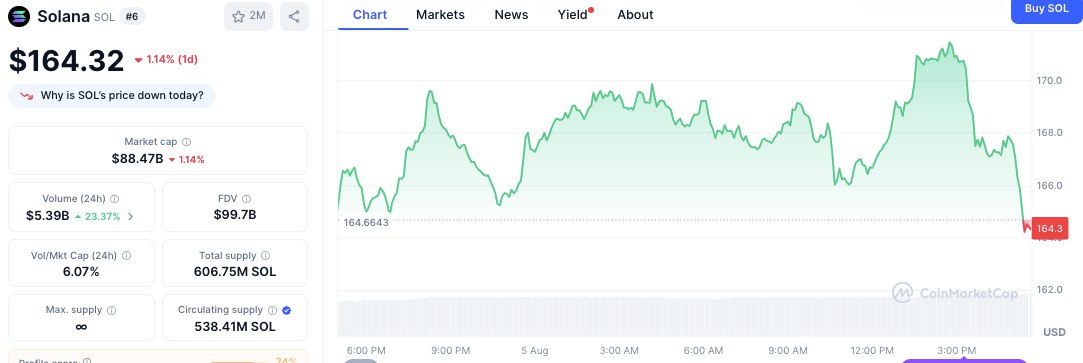 SOL traded above $171 on August 5 following a rally that began the previous evening. The move peaked midday, but strong bearish pressure during the U.S. trading session led to a reversal. CoinMarketCap data shows the price fell back to $164.32 by press time, reflecting a 1.14% intraday decline.