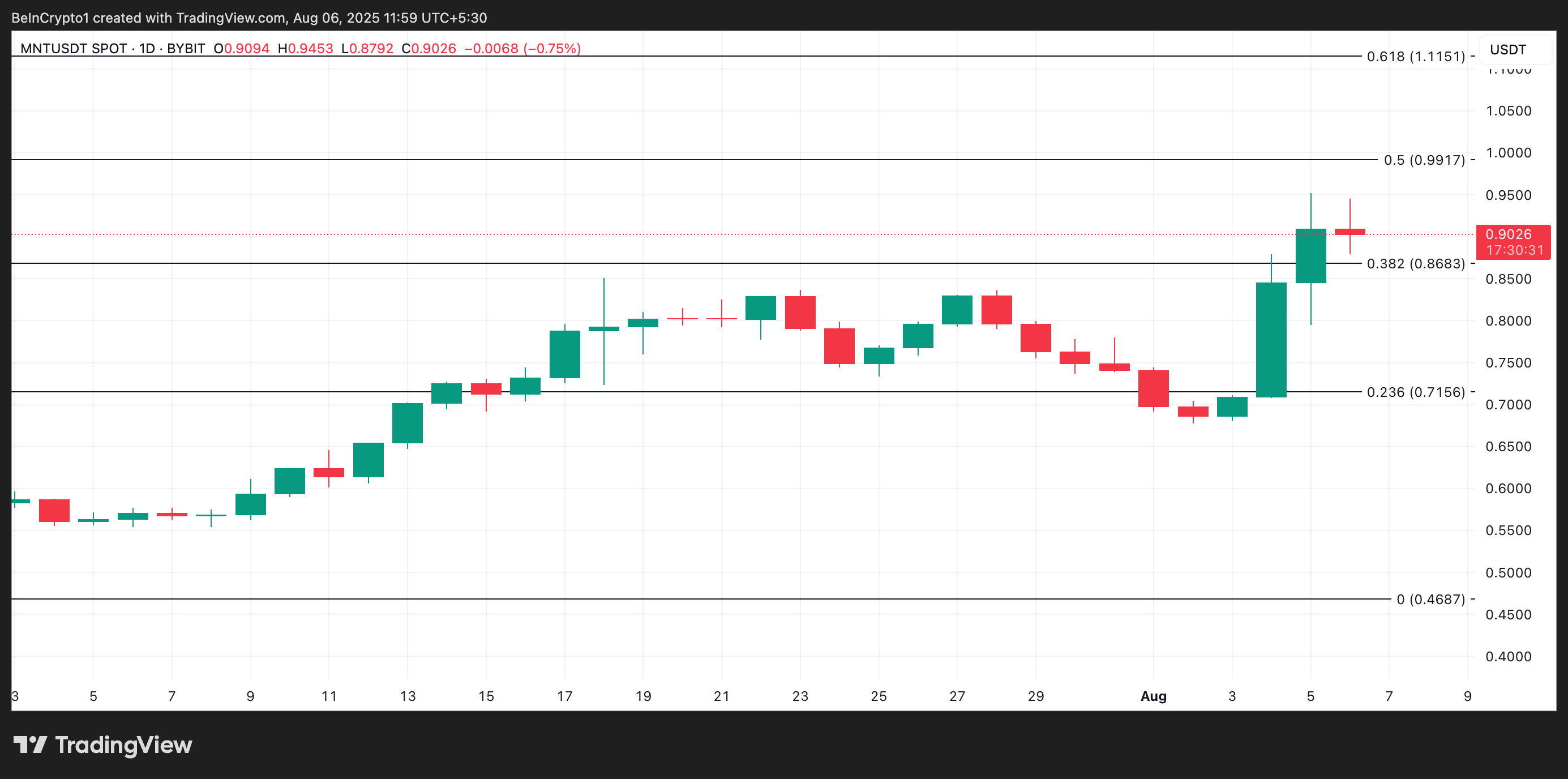 On the other hand, if profit-taking resumes, MNT could lose strength and attempt to test the new $0.86 support. Should it fail to hold, the token’s price could fall to $0.71.