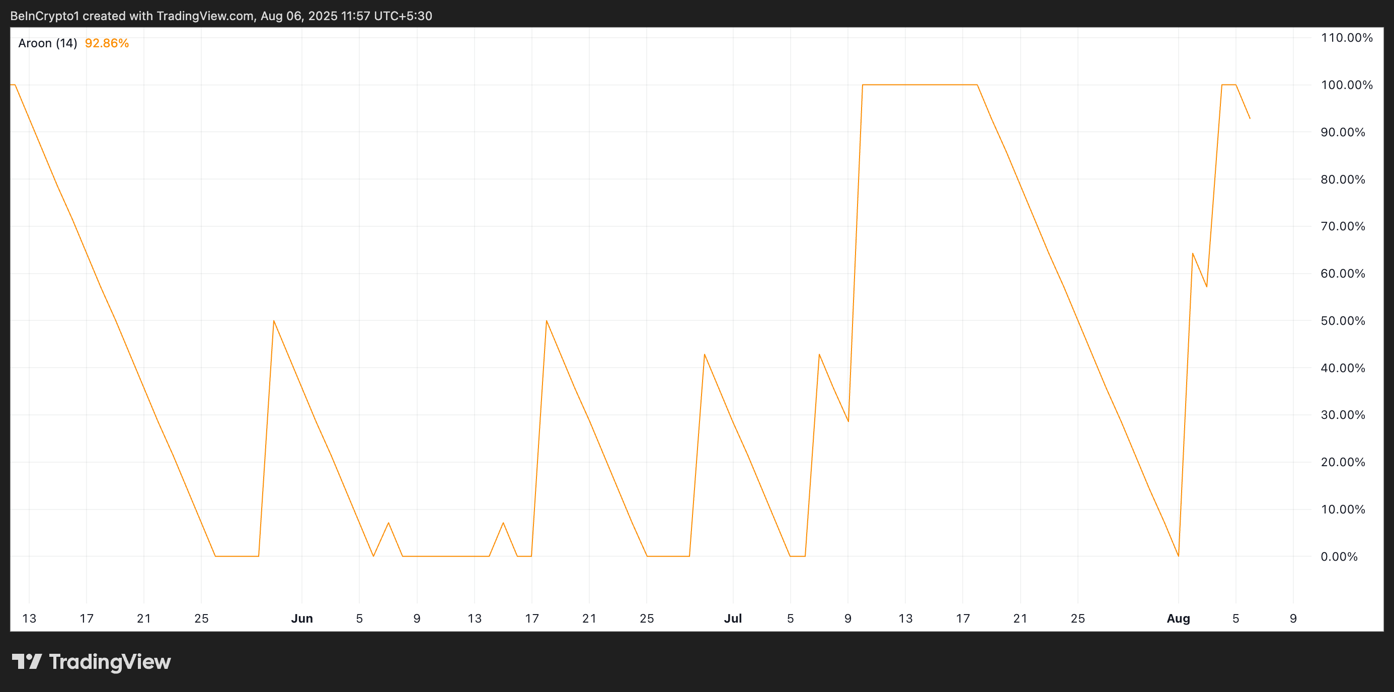 When the Aroon Up line is at or close to 100%, it suggests that recent price action has consistently hit new highs, indicating strong bullish momentum. This is true of MNT, whose price has rocketed to a five-month high over the past three days.