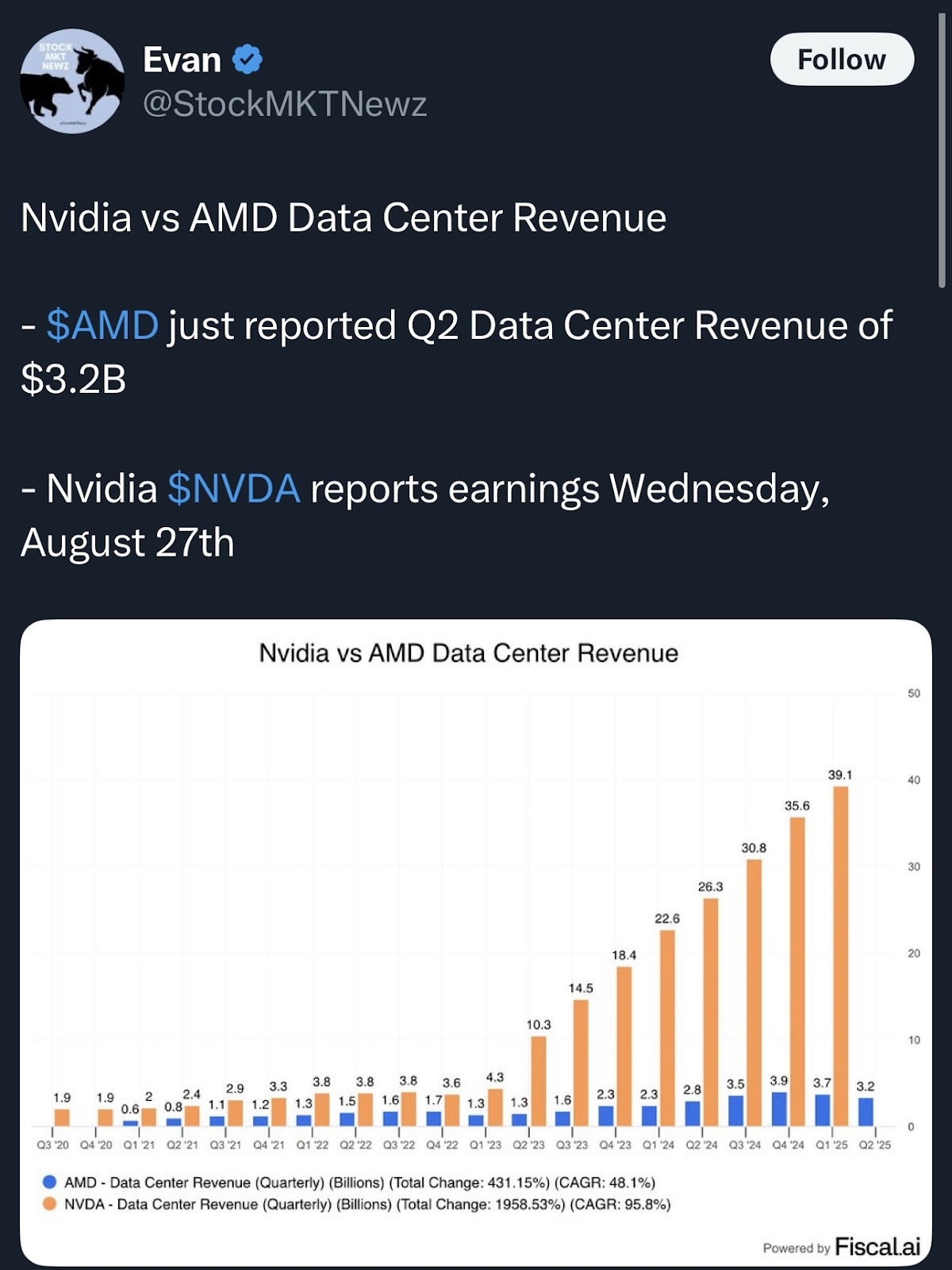Even profits (net income) were strong: $872 million, compared to just $265 million last year. They also said their data center sales grew to $3.2 billion, up 14%.